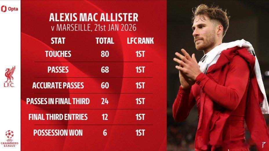 麦卡的状态恢复了麦卡在利物浦客战马赛的比赛中触球和传球次数最多。他完成了13次穿透防线的传球,在本赛季利物浦球员的客场比赛中位列第三。触球:80 第一传球:68 第一准确传球:60 第一进攻三区传球:24 第一进攻三区进入次数:12 第一赢回球权:6 第一