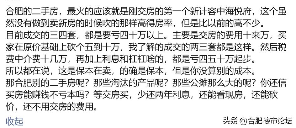 合肥当下最火的二手房,就是第一个新计容中海的,应该成交4套了,看到一个人说,基本这些人也都是亏四五十万,这还是说保本卖的。 合肥买房2大难以捉摸的现象。第一,就是非要去买首开,就是这个年头了还要去买首开,然后等2年交房。最近3年合肥所有的新房交房后,百分之99的盘成交的二手房或者所谓工抵的都是便宜50万以上吧,有的还是便宜100万以上。 第二,还有高杠杆去买的。这个里面有2种人,第一种是还想赚一笔的,但是目前没有一个能全身而退的,第二个就是喜欢住好的,没多少钱,然后去透支,背负高额房贷的,这种还可以理解,先住好的再说,假如收入稳定还好,收入不稳定,就是一个炸弹了。