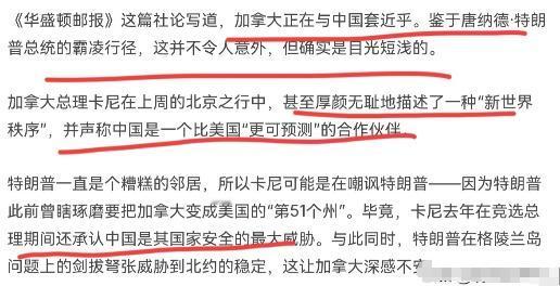看见加拿大和中国缓和关系,美媒心里非常堵得慌!时隔几天,美媒还过不去,竟然刊文嘲讽加拿大!1月23日,根据美国《华盛顿邮报》报道,美媒声称,加拿大为了“嘲讽”特朗普而选择拉拢中国,但这终将自食其果。加拿大正在与中国套近乎。鉴于唐纳德·特朗普总统的霸凌行径,这并不令人意外,但加拿大的做法确实是“目光短浅”。   谁都知道,加拿大总理卡尼访华签了一堆协议,从电动汽车关税到农产品进口,明摆着要在经济上给自己找条新出路。这事搁五年前不敢想——那时候特鲁多政府跟着美国喊人权口号,中加关系冷得能结冰。可现在为啥变了?特朗普的关税大棒最清楚。   2025年美国对加拿大钢铁加征35%关税,直接让加拿大GDP掉了0.3%。更狠的是,特朗普在达沃斯公开把加拿大说成"依赖美国的小兄弟",连特鲁多飞去海湖庄园求和,都被嘲讽成"加拿大州长"。   这种羞辱让渥太华明白:跟着美国混,连尊严都是奢侈品。就像加拿大农民说的,美国人不要的油菜籽,中国人敞开收;美国车企看不上的电动汽车市场,中国愿意带着加拿大搞研发——生意场上,谁给实惠谁就是真伙伴。   美媒酸就酸在这儿:加拿大居然绕过"西方阵营"找生路。《华盛顿邮报》说人家"目光短浅",可加拿大统计局的数据最诚实——去年中加贸易600亿美元,中国是加拿大第二大贸易伙伴。   特鲁多他爹1970年顶着美国压力和中国建交,现在孙子辈不过是把爷爷的务实精神捡回来。   再说了,美国交通部长说加拿大"会后悔",可加拿大老百姓算的是另一笔账:中国电动车价格比美国便宜一半,为啥要替美国的技术落后买单?   最有意思的是特朗普的态度。这位前总统一边骂盟友,一边又说"加拿大应该和中国做生意",这种矛盾恰恰暴露了美国的双重标准——你可以赚钱,但必须听我指挥。   但加拿大不是墨西哥,更不是日韩,人家有3800万人口、998万平方公里资源,凭啥要在大国博弈里当耗材?就像加拿大网友说的:"我们不是美国的第51个州,有权选择自己的朋友。"   美媒的焦虑,本质上是霸权思维在作祟。他们习惯了"盟友必须听话"的剧本,突然看到加拿大算经济账不算政治账,就觉得天塌了。   可现实是,特朗普时代的霸凌让北美产业链出现裂缝,加拿大只是率先补上了这个缺口。当美国还在纠结意识形态时,渥太华已经在和北京谈免签、谈能源合作——毕竟对普通加拿大人来说,饭碗比口号重要,稳定的市场比捉摸不定的"老大"可靠。   这种转变,说到底是小国在大国夹缝中的生存智慧。加拿大不是第一个,也不会是最后一个。美媒与其嘲讽别人,不如问问自己:当"美国优先"变成"美国独享",谁还愿意陪着演这场独角戏?   官方信源及发布时间:央视新闻《国际锐评丨中加关系势头来之不易,要做好“四个伙伴”》,2026年1月17日21时48分