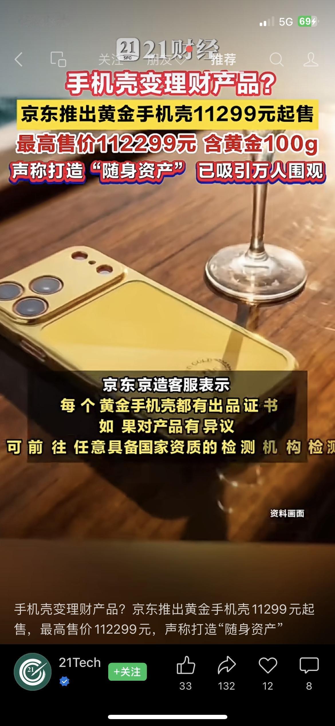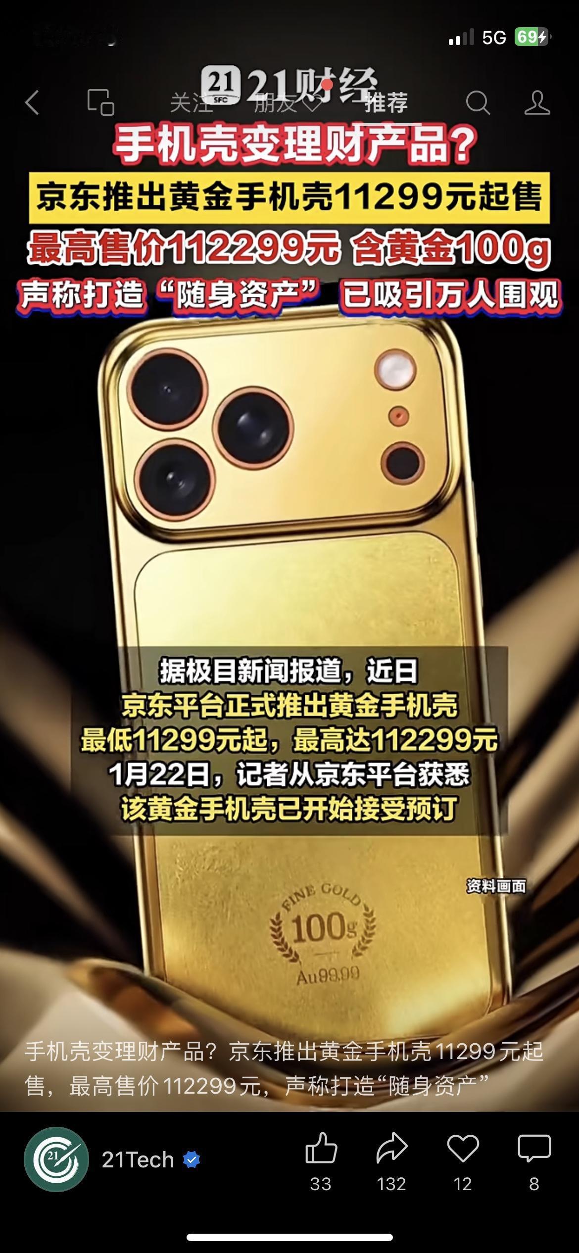 黄金手机壳竟成理财产品?京东上架太离谱!这款黄金手机壳11299元起售,最高版本卖到112299元还含100g黄金,官方号称是“随身资产”能保值,一上线就引上万网友围观。不少人吐槽这就是换个噱头卖黄金,理财属性远不如纯金条,纯属智商税!你会花上万买这手机壳当理财,还是觉得根本没必要?黄金理财 财经热点手机壳行情