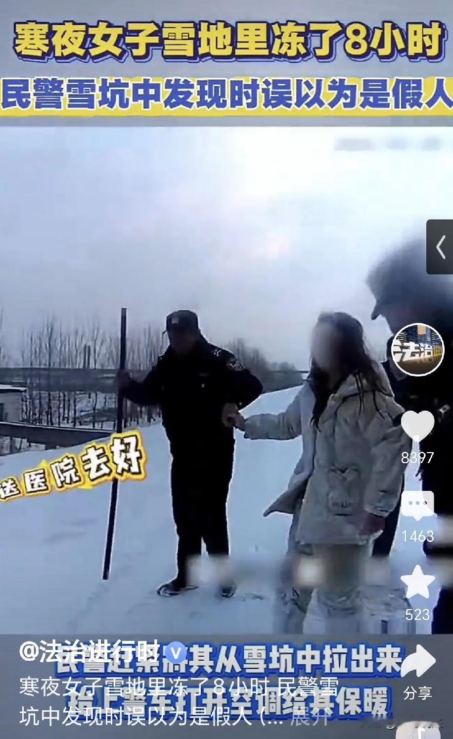 “真抗冻呀!”安徽蚌埠,早上7点,派出所接到报警,说雪地里有个假人,民警立刻行动,谁知到假人跟前一看,原来是个女子在雪坑里躺着,她穿着睡衣,领子漏风,腿脚已经冻得僵硬,民警立刻把她抬上警车,打开空调给她暖着,又把她送到了医院,经过检查,女子身体没有大碍,经过了解,女子半夜11点离家出走,冻到了现在,网友: 命不该绝,难道是在惩罚老公? 1月20日,安徽蚌埠寒风凛冽,大雪纷飞,一夜之间,地面全部被大雪覆盖。 早晨7点,天才微微发亮,巡防大队和解放派出所接到了报警电话。 电话那头,报警人急急匆匆,说他在淮河大坝附近,看到厚厚的雪地里似乎有个人,躺在那里一动不动。 民警们立刻行动,他们带好装备,顶着寒风,马不停蹄的往现场赶去。 一路上白雪皑皑,车辆行驶异常的艰难,好不容易开到了现场,离老远就看到马路对面确实有个人在那里一动不动。 民警从车上下来,路面走起来咯吱咯吱,民警朝那人走去,那人依旧毫无动静。 民警就纳闷,难道对方是个假人?民警喊了一声,你怎么搞的? 这时他们看到,那人似乎有了些许反应, 他们走近一看,原来是个女子,她半跪半坐,在地上已经冻得没了动静。 民警走到她跟前一看,女子穿着一身棉睡衣,领口漏风,身上的衣服落满了白雪。 民警对着她大喊,你怎么搞的?女子听到,似乎有了回应。 民警一边喊着,一边伸出手去拉她,女子慢慢抬起手来,看她的样子,也是想让民警拉她起来。 可是她抬手时发现,自己的腿已经僵硬,她不能挪动,只有眼珠还能转动。 民警们组 织了人手,轻手轻脚将女子抬了起来,他们怕女子已经冻僵,稍有差池就会给她造成二次伤害。 女子被缓缓的抬进了车里,她一身冰凉,嘴唇发紫,脸上被冻的一层雪白。 女子衣服落满了雪粒,雪粒包裹着衣服,早被冻得梆硬梆硬。 女子腿脚麻木,手脚冰凉,半天在车里都缓不过来。 民警打开空调,立刻将温度调到最高,他们想让女子赶紧暖和起来,唯恐女子已经被冻坏。 他们怕女子长时间受伤,立刻开车就赶往了医院,雪地里行驶艰难,好在路上一切顺利。 经过初步的检查,医生发现,女子的身体并无大碍,只是因为她在雪地里待的时间过长,因此导致了失温状态。 女子渐渐缓了过来,经过了解,女子是在前一天的夜里11点从家中出走,按照时间推算,她在雪地里待了整整的8个小时。 至于她为啥离家出走,又为何会倒在雪坑里不出来,具体原因还在调查。 万幸的是,女子的身体并没有冻坏,如果这一夜被冻出来个好歹,将来后悔也来不及了。 有人做出猜测,难道说是和老公生气了,所以离家出走,想吓一吓他,让他担心害怕失去自己? 如果是这样,那就太不值了,无论有什么矛盾,伤害自己都是不可取的办法。 更有人说,这里幸好是安徽,吓死人了,这个时间如果是在东北,别说8个小时,就穿成这样待在外面,一两个小时都冻硬了。 有人认为,这女子太傻,竟然自己惩罚自己,如果真是生气吵架,离家出走,为啥不带钱和手机? 你总能找到联系的人吧?实在不济,你也可以报警求助,这样一动不动的待在雪里,任凭自己被冻僵冻坏,这是有多想不开? 这样较劲,亏得是自己的生命,那个气自己的人,人家在家里暖暖和和,没一点损害。 女子傻呀,你这样对待自己,划来划不来? 无论和谁生气,老公也好,婆婆也好,生完气该吃吃该喝喝,无论是谁对谁错,在生命面前,一切都是微不足道。 这半夜三更,外面黑漆马虎,又是下着鹅毛大雪,还有冷风刺骨。 这女子也是胆够大了,还敢一个人半夜出走,这要是遇到了歹人,想喊都没人听见。 有些女人也是脑子不通,习惯用这种自虐的方式表达愤怒,但是犟也没用,最终害的还是自己。 但无论如何,警方的救援,让她的安全得到了保障。 蚌埠的民警,用行动诠释了责任担当,他们就像冬日暖阳,照亮了黑暗,温暖了人心。 民警们不畏寒雪,接到报警就立刻行动,如果没有他们,女子不知道还要冻到什么时候。 这场救援,也让我们明白,在面对困难和危险时,总有那么一群人,会毫不犹豫地伸出援手,守护着人们的生命安全,他们才是这世上最可爱的人! 对此,你怎么看?