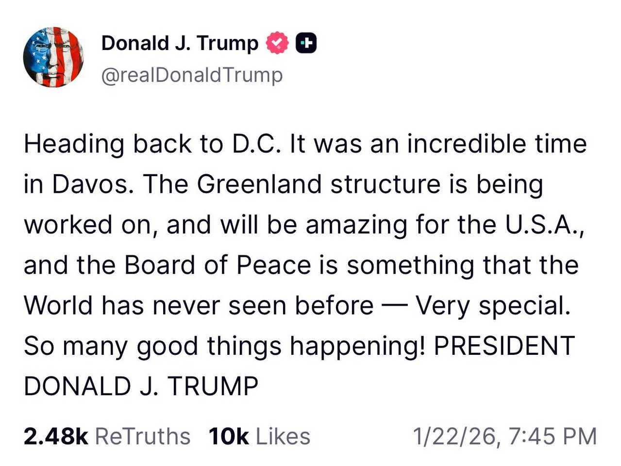 特朗普通过 Truth Social 发文:即将返回华盛顿特区。在达沃斯度过了一段令人难以置信的时光。格陵兰岛的项目正在推进中,对美国来说将意义非凡,而和平委员会的成立更是世界前所未见的创新之举——非常特别。如此多美好的事情正在发生! 海外新鲜事 热点现场 达沃斯论坛