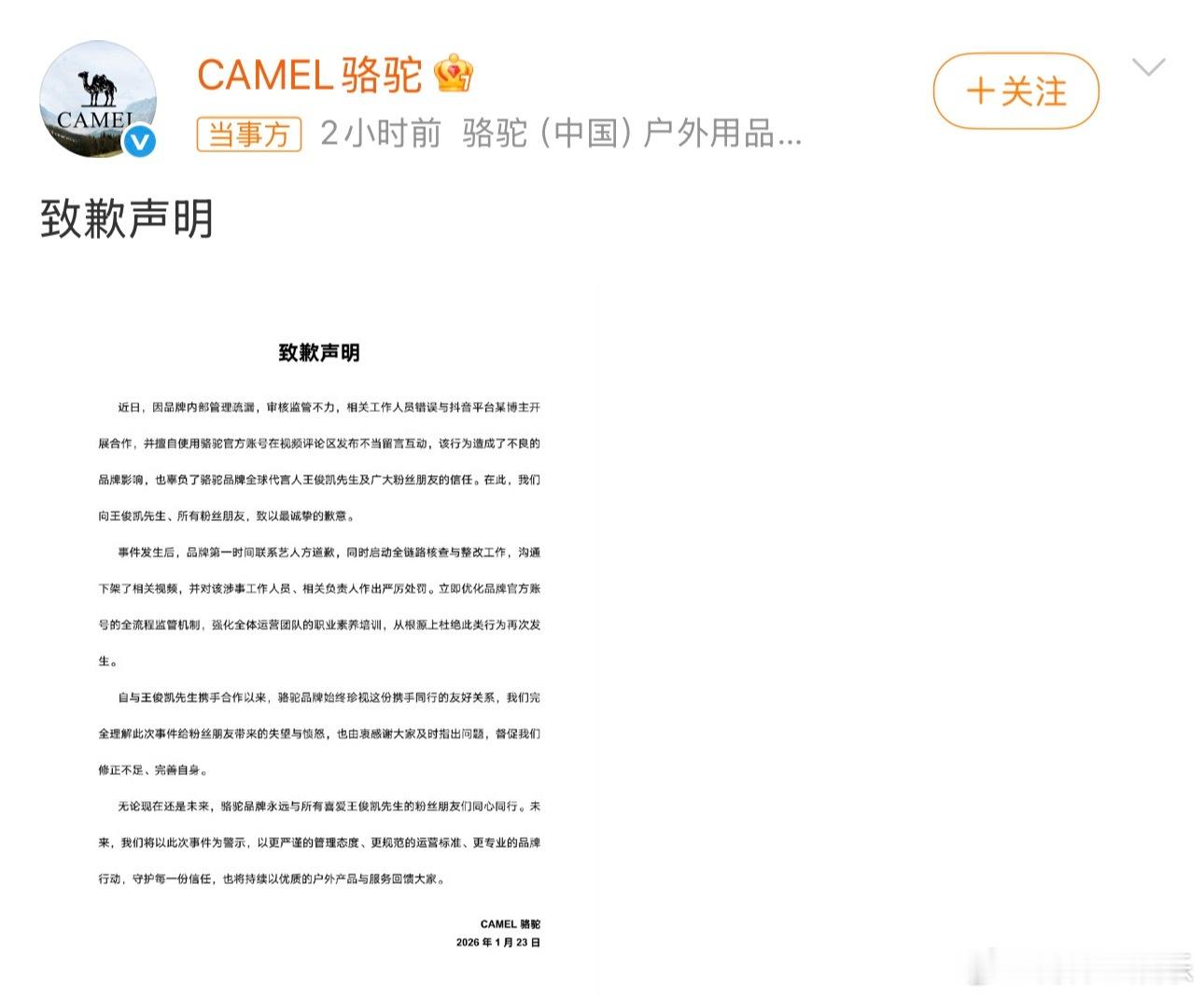 骆驼向王俊凯致歉近日,骆驼品牌方相关工作人员与某博主开展合作,并使用官方账号在视频评论区发布不当留言互动,引发热议。今日,骆驼官微发布声明向王俊凯及其粉丝群体致歉。声明中称该行为是“内部管理疏漏,审核监管不力”所致,事件发生后已第一时间联系艺人方道歉,同时启动全链路核查与整改工作,沟通下架了相关视频,并对该涉事工作人员、相关负责人作出严厉处罚。