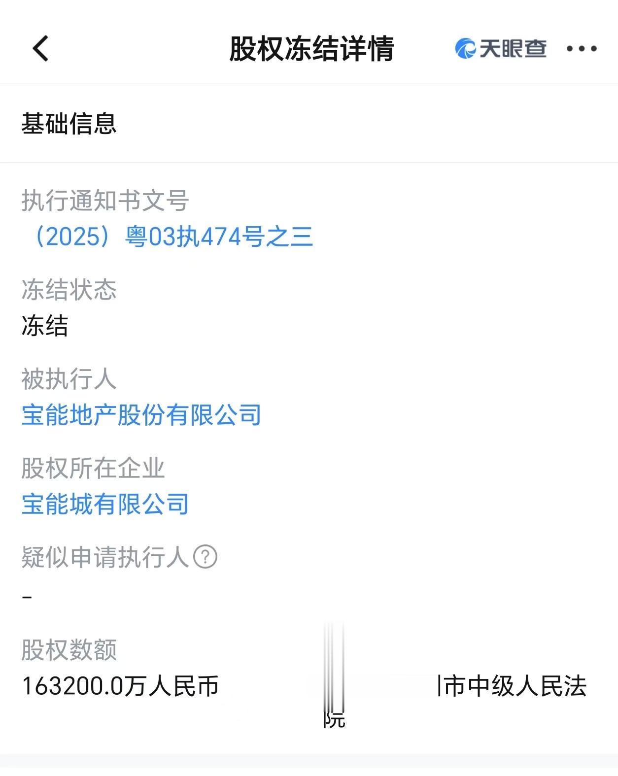 1月23日,界面新闻从天眼查APP获悉,近日,宝能地产股份有限公司(简称宝能地产)新增一则股权冻结信息,股权所在企业为宝能城有限公司,冻结股权数额为16.32亿人民币,冻结期限为3年,执行法院为广东省深圳市中级人民法院。