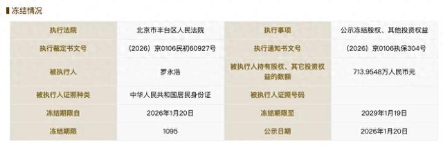 据澎湃新闻报道,国家企业信用信息公示系统网站显示,1月20日,罗永浩新增一则股权冻结信息,股权所在企业为锤子科技(成都)股份有限公司,冻结股权数额713万余元,冻结期限自2026年1月20日至2029年1月19日,执行法院为北京市丰台区人民法院。