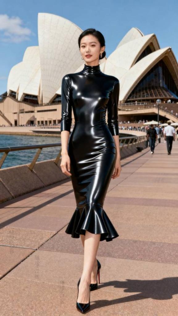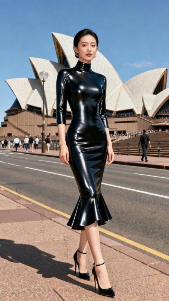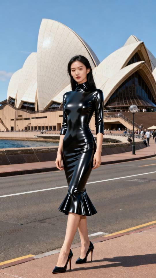 冬日生活打卡季黑裙女子悉尼歌剧院前留影。乳胶乳胶裙乳胶连衣裙