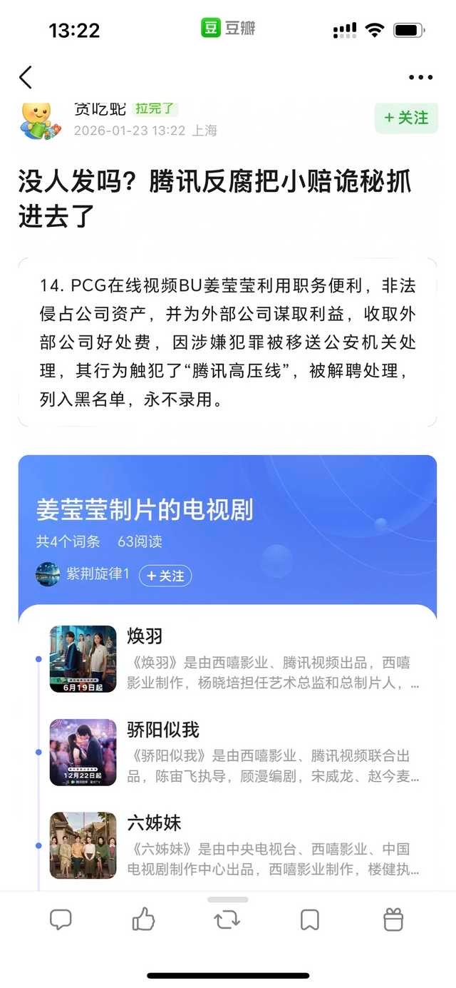 这是真的吗?腾讯反腐把六姊妹,骄阳似我,焕羽制片人姜莹莹抓了? 腾讯反腐事件后续