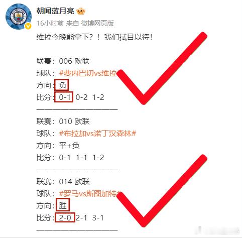 兄弟们,昨晚的战绩,我跟大家一样,心里五味杂陈。维拉这场,咱们方向精准,甚至比分都压中了,罗马那边也是全线飘红,这两场打得行云流水,值得庆贺!唯独可惜了诺丁汉森林这场! 兄弟们,那叫一个难受啊!两个方向都没能拿下,眼睁睁看着煮熟的鸭子飞了,那种憋屈和不甘心,我比谁都懂,因为我们是一条战壕里的兄弟!今天联赛回归! 早场的澳超就是我们的冲锋号角,备好你的子弹,我们老地方见! 置顶小家庭里,我准备好了今晚的核心战报,带大家把昨晚的遗憾统统拿回来!信我的,今晚我们必红!澳超五大联赛这里有料西甲