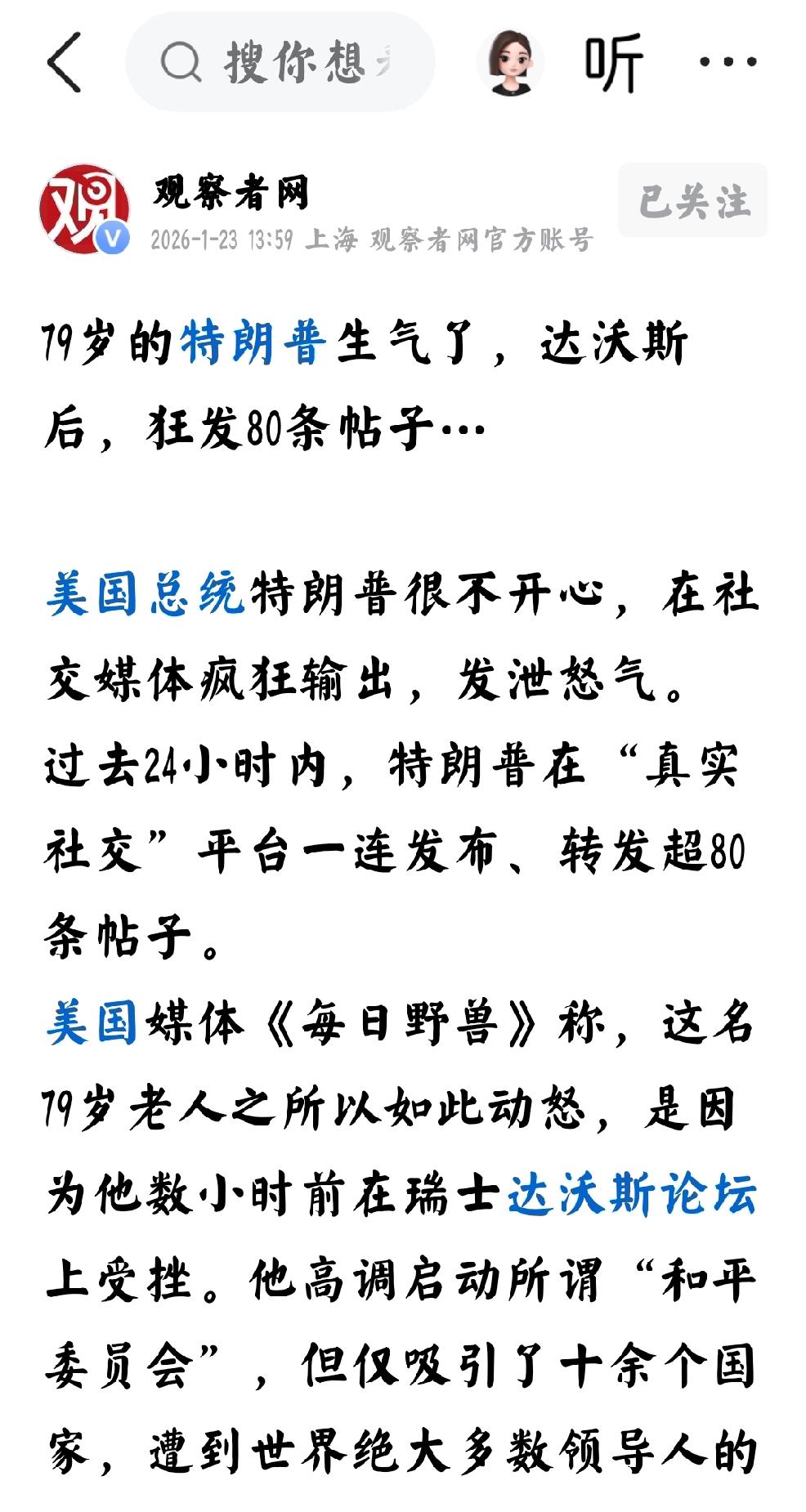 79岁的特朗普,要操心血管 根据1月3日观察者网报道:79岁的美国总统特朗普,在达沃斯回来之后,狂发80条帖子…… 个人认为:79岁的特朗普,应该操心自己的心脑血管了。这是个让人操心费脑的老家伙。 个人认为,其实,让特朗普恼真正恼怒的是已经有两家欧洲基金抛售美债了,那么第三家很快就会到来?这个趋势要赶紧堵住,不然美国的大麻烦就会加速到来。