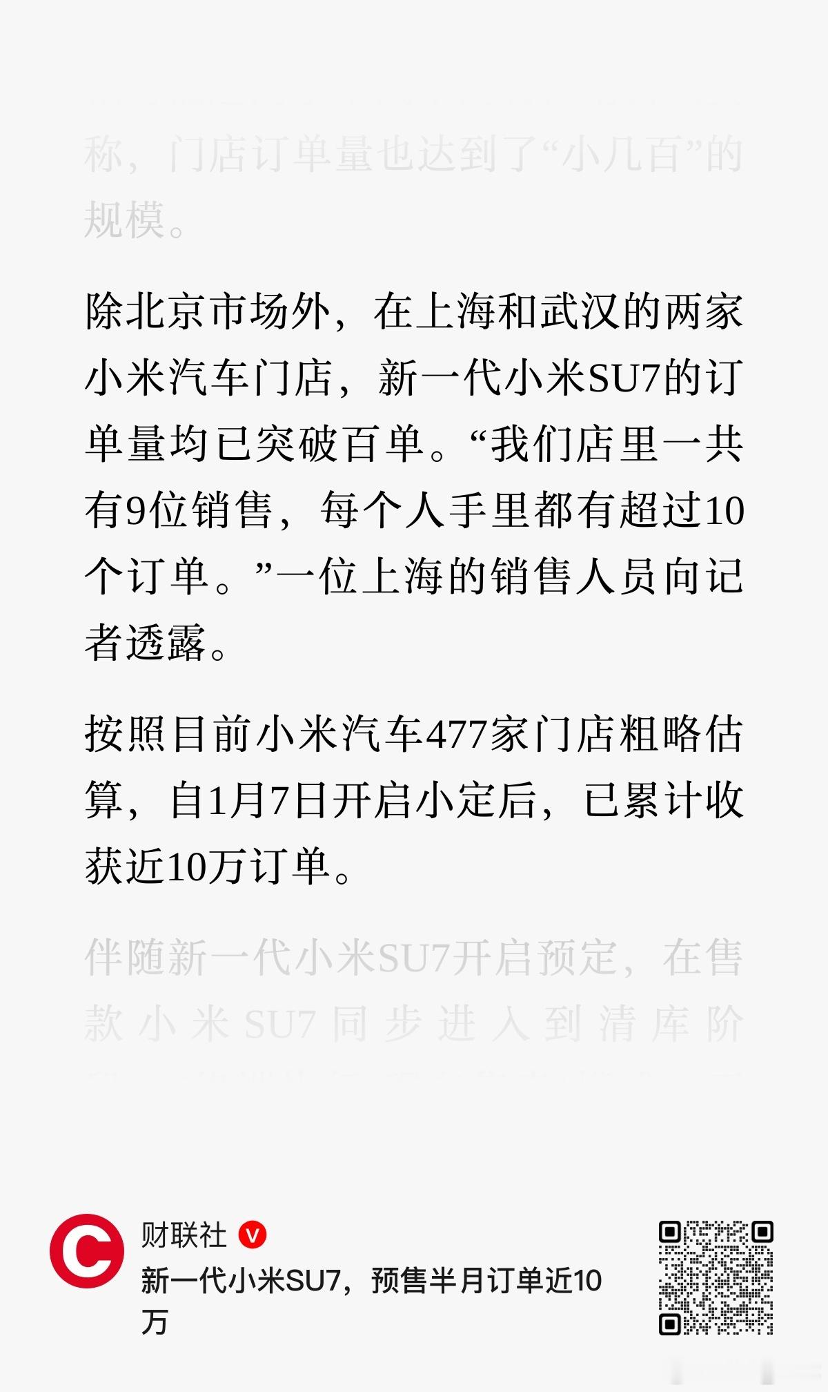 记者走访了上海和武汉两家小米门店,调查到“店里 9 个销售,每个人手里超过 10 个订单”。于是得出结论→门店订单量均已突破百单然后根据小米全国 477 家门店粗略估计,新一代小米 SU7 累计收获 10 万小订,真是个人才啊先不说上海和武汉分别是小米销量第二名和第五名,就是用单店销量 100 台乘以 477 家门店,也算不出 10 万个小订吧....