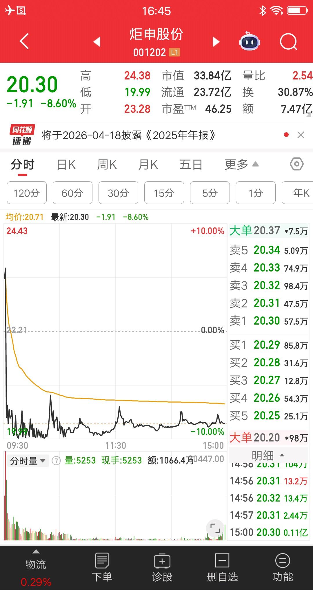 A股今天最惨的票诞生了 盈方微,集合竞价高开9个多点 开盘后直线跳水,此后一路跌到尾盘 收盘跌幅5.83%,剪刀差近15% 该票此前走出了三个一字板 今天三进四失败 炬申股份,集合竞价高开5个点 开盘后直线跳水,最低杀到跌停价 该票此前已经两连板了,今天二进三失败 高点买入的资金有点惨呀,当天就吃大面 如果下周继续低开,亏损还会加大 保持乐观心态,继续加油吧