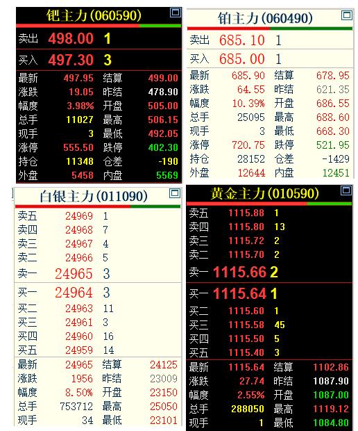 今天是周五, 本周的最后一个完整交易日, 国内贵金属强势运行, 黄金和白银创新高, 铂金和钯金大幅飙升。 最终, 国内黄金期货主力 收盘于1115.64元,涨2.55%; 白银期货主力 收盘于24965元,涨8.5%; 铂金期货涨10.39%; 钯金期货涨3.98%。 您拥有那一个?