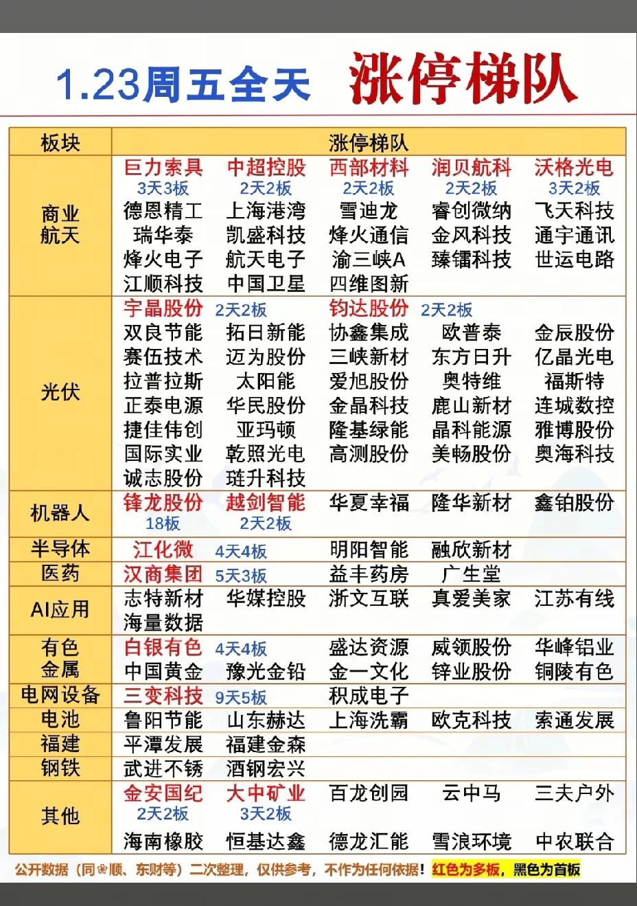 1月23日,周五A股涨停梯队一览表!!! 今日,商业航天板块继续发酵,巨力索具成功晋级3连板,中超控股、西部材料成功晋级2连板;光伏板块今日异军突起,宇晶股份、钧达股份今日成功晋级2连板,双良节能、拓日新能等股今日纷纷涨停!!!