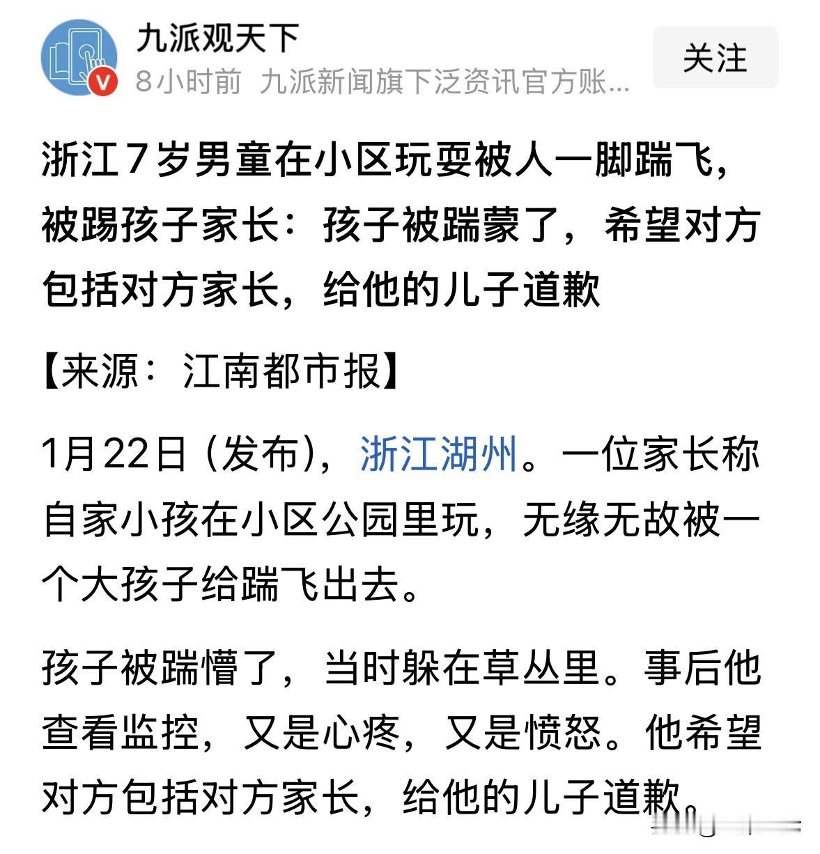 浙江湖州,7岁男孩在小区独自玩耍,他想加入另外几个孩子一起玩,却被打头的一六年级大孩子无缘无故踹了一脚肚子,男孩被踹得飞了出去,一脸茫然,但他没哭也没闹,而是可怜巴巴躲进了一旁的草丛里。家长调出监控看到这一幕后心疼不已,他们希望对方家长能出来道个歉,这事儿就过去了,可对方却装聋作哑,始终不出来回应。 1月22号这天下午,一小区公园里,7岁的小男孩独自在小区里玩,没招谁也没惹谁。 他看健身设施那里有几个同小区的孩子,就跑过去,想加入他们一起玩。 谁料,其中最高,据说已经上六年级的一个大孩子看他跑来,抬脚就照着小男孩的肚子踹了一脚。 这一脚力度有多大?监控视频看得人心里一紧:小男孩整个人直接被踹飞了出去,重重地摔在地上。 最让人看着难受的是孩子被打懵后的反应。 他没哭也没闹,就是傻在那儿了,他不懂自己为什么无缘无故被打了。孩子眼神直勾勾的,显然是吓坏了。 过了好几秒,他才晃晃悠悠爬起来,第一反应不是找家长,也不是反击,而是扎进旁边的草丛里躲了起来。 好像只要把自己藏在草堆里,那个可怕的大孩子就找不到他了。 这一幕,被后来赶来的家长施先生看在眼里,疼在心里。 施先生虽然工作忙,但平时对孩子教育很上心。当他调出监控看到这一幕时,气得不行。 视频拍得清清楚楚,两个孩子之前没有任何交集,没吵架,甚至连眼神交流都没有。 他认为,那个大孩子就是纯粹的坏,纯粹的手痒,拿比自己小的孩子当沙袋练脚法。 这算什么事?这不就是霸凌吗?施先生气得血压飙升。他不图别的,就图个理。 哪怕孩子之间打闹受了伤,只要对方家长说句:对不起,是我家孩子没管教好,这口气也就顺了。 可现实呢?从出事到现在,好几天过去了,对方家里静得跟没人似的。 没有电话,没有登门,连句最起码的“不好意思”都没有。 这种态度,比那一脚还伤人。 施先生表示,我不缺那点医药费,我也不想把事情闹大让孩子在学校难做人。我就想要个态度。做错了事就要认,这不仅是给我看的,更是给那个六年级的孩子看的。如果他现在觉得打了人可以不用负责,将来走上社会得闯多大的祸? 这话说得在理。那个六年级的男生,十二三岁了,正是懂事的年纪。 他这一脚下去,如果家长不及时拉一把,反而帮着捂盖子,那在他心里就会种下一颗恶的种子:暴力是解决问题的方式,或者暴力是不需要付出代价的。 截止到现在,孩子和家长还在等一句“对不起”。而那个踹人的六年级男生,还在若无其事地过日子。 我们常说子不教,父之过。希望对方家长能早点醒悟,别为了那点可怜的面子,丢了做人的基本良知。 有人说这个家长非常理智,没有暴打对方,而且要求对方及对方家长道歉!作为父母,谁不疼痛自己的孩子?对方家长应该好好管教自己的孩子,真诚向对方赔礼致歉! 其实,这个踹人孩子的家长,应该抓住这个时机给受害者好好地道歉,给自己的孩子好好的教育。不然,对双方都没有好处,对自己的孩子害处很大。 那么,从法律角度怎么看这事? 《民法典》第1188条规定:无民事行为能力人、限制民事行为能力人造成他人损害的,由监护人承担侵权责任。监护人尽到监护职责的,可以减轻其侵权责任。有财产的无民事行为能力人、限制民事行为能力人造成他人损害的,从本人财产中支付赔偿费用;不足部分,由监护人赔偿。 从法律层面来看,施暴者未满14周岁通常不予行政处罚,那谁来为这一脚买单? 踹人的六年级男生大概率也就12岁左右,属于限制民事行为能力人。 按照法条,他把人踢伤了,赔偿责任第一顺位就是他的父母。 家长可能觉得,孩子还小,不懂事,打了人也不用负责。但是,孩子没钱赔,或者孩子不懂事,家长必须兜底。 既然你生了他、养了他,你就有义务管教他。现在孩子在外面惹了祸,造成了别人的身体伤害,甚至可能有心理创伤,家长就必须站出来赔钱、道歉。 民法典规定的侵权责任方式包括:停止侵害、排除妨碍、消除危险、返还财产、恢复原状、赔偿损失、赔礼道歉、消除影响、恢复名誉。 对方家长至今未道歉,不仅是道德上的缺失,更是法律上的未履行义务。如果施先生最终去法院起诉,这一条是必判的。 现在的局面是对方家长沉默、不回应。但在民法典的框架下,这种沉默是无效的。 7岁的孩子被无故暴力袭击,吓得躲进草丛,这完全可能造成心理阴影。这种精神损害抚慰金,也是监护人必须承担的。 大孩子无故踹人,且事后家长不道歉、不理会,这恰恰证明了家长没有尽到监护职责。他们没有教育孩子尊重他人生命健康,没有在事后引导孩子承担责任。 所以,家长无法免责过主张减责。 对于这件事,你怎么看? 欢迎关注@一案一论