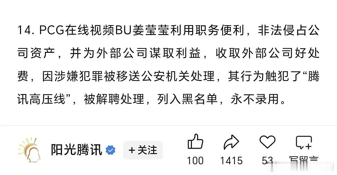 腾讯反腐把制片人抓进去了,今天中午公布的,姜莹莹在职期间的作品包括《骄阳似我》《焕羽》《六姊妹》等