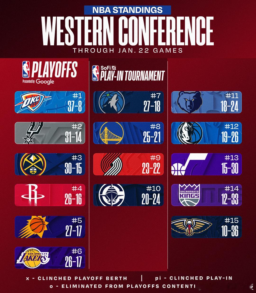 东西部排名👇火箭不敌76人结束3连胜;湖人输球后排名西部第6,森林狼4连败;勇士两连败,开拓者和独行侠4连胜独行侠战胜勇士快船战胜湖人