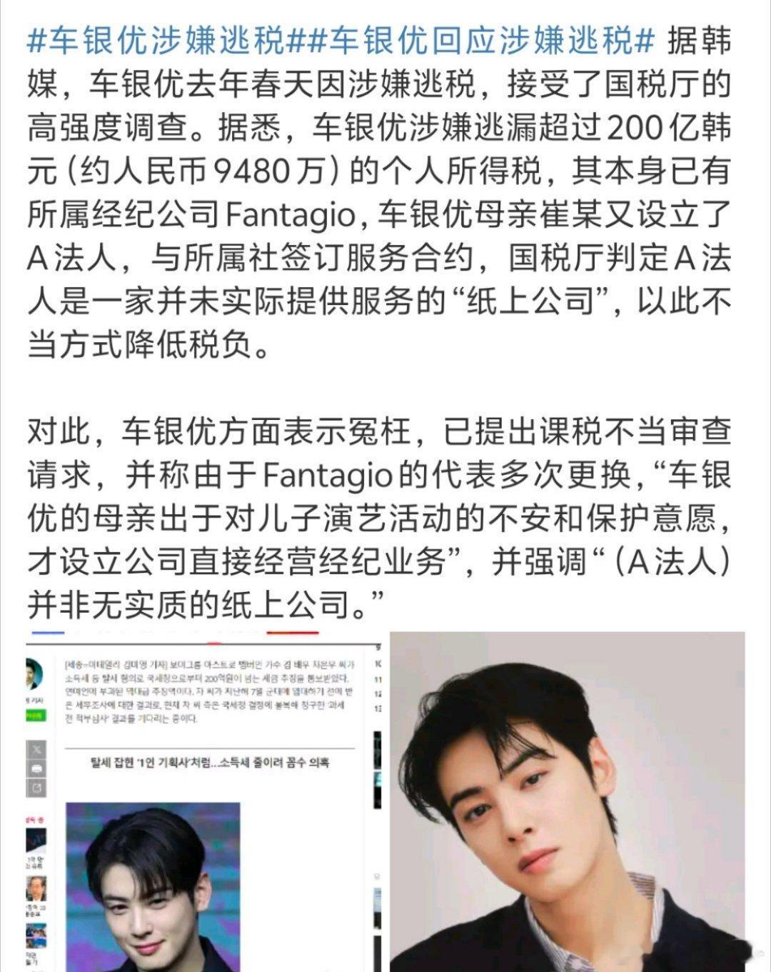 车银优陷逃税风暴💸 涉200亿韩元(约9480万人民币),母设A法人被指“纸上公司”降税⚖️ 方回应:为保护其经纪业务非纸壳!兵役争议同步炸:要求税务结果延至入伍后公布,被批“用服役特权避监督”🪖 车银优宋慧乔被称为逃税情侣