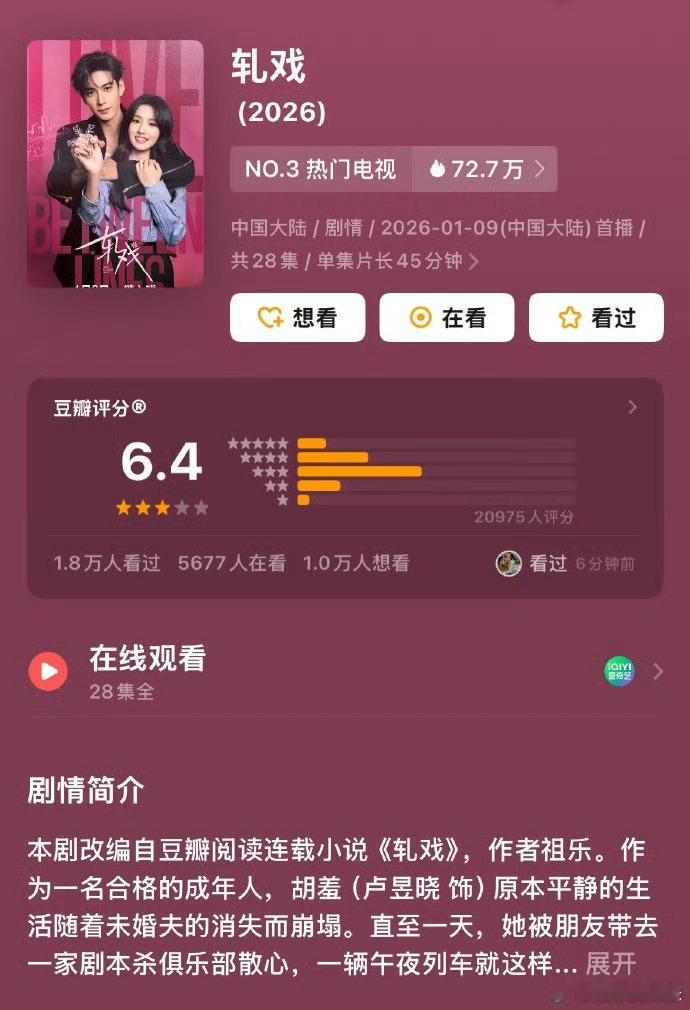 轧戏豆瓣开分轧戏豆瓣开分6.4 主演电视剧《轧戏》豆瓣开分6.4。据猫眼专业版数据,截至当前全网累计有效播放量已超4.66亿。 你们看了吗?