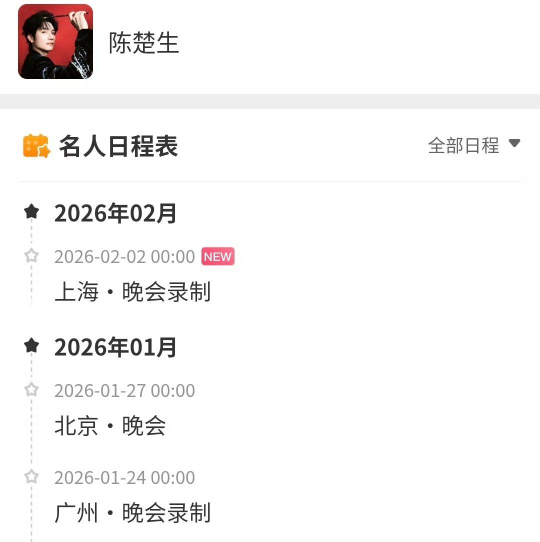 陈楚生增加了新的行程单,完啦,彻底没有央视春晚了[可怜]! 虽然没有央视总台的春
