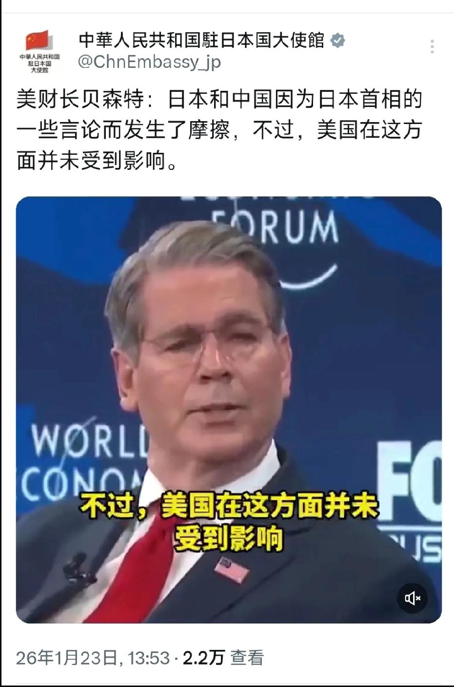 美国的心思 根据中国驻日本大使馆1月30日发文:“美财长贝森特,日本和中国,因为日本首相的一些言论而发生了摩擦。不过,美国在这方面并没受到影响。”中国驻日本大使馆还转发了贝森特的完整视频。 个人认为:个人相信日本大部分民众和政府高层,将会在心里破防,但是口头上却是嘴硬。毕竟这是美国重量级人物的表态,日本人从心里是不能接受的,感到了不平衡的对待。难道日本人,鞍前马后的做着奴才,却落得如此下场吗? 同时,个人还感到:美国人的一种恶趣味— 幸灾乐祸。