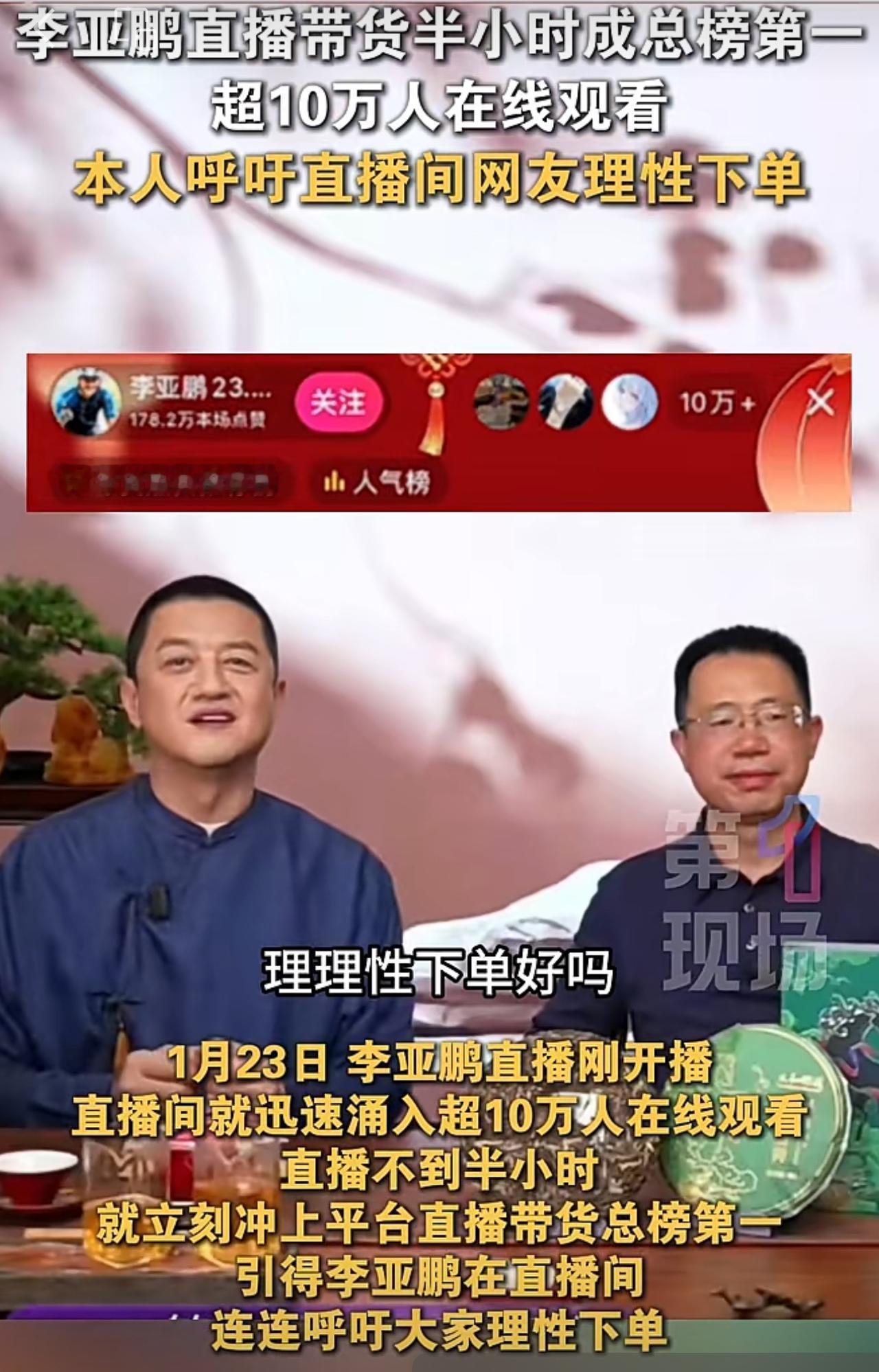 恭喜李亚鹏!1月23日直播到货冲到带货榜第一,让长期霸榜的董宇辉暂时屈居第二! 李亚鹏直播一个小时卖出800多万货品,10万多人涌入直播间,疯狂购买,很多网友说必须让李亚鹏冲到带货榜第一! 李亚鹏也是非常开心,不过他一直说感谢大家支持,但是大家一定要理性下单! 李亚鹏终于依靠人品逆风翻盘,他成了直播带货王!