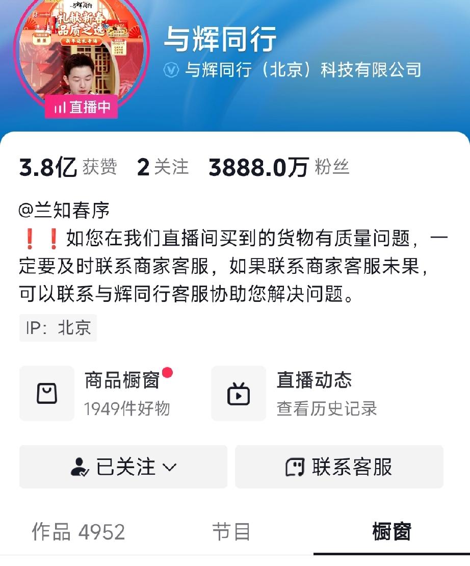 今晚22:30,宇辉下播时,与辉同行带货榜排名第一,粉丝突破3888万。评论区飘
