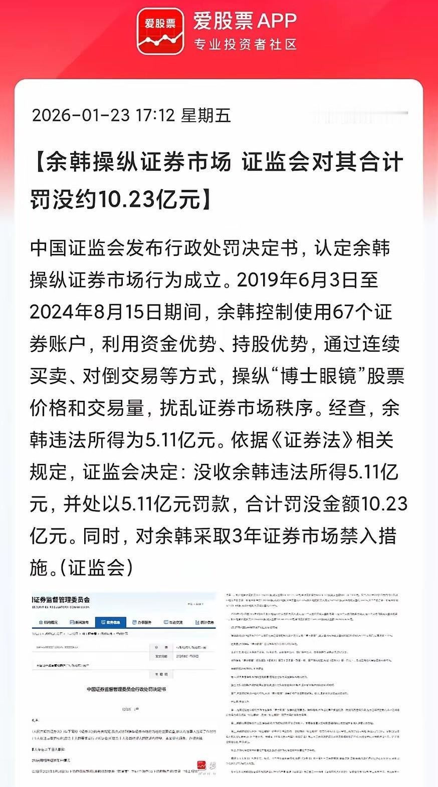 天价罚单又来袭,违规炒股当警惕! 今日盘后,监管层裁定自然人余韩操纵证券市场成立:这家伙5年利用67个账户资金和持股优势,用尽连续买卖、对倒交易,从2019年开始,把博士眼镜股价从5元多做到2024年的20几,狂赚了5.11亿。处罚明确:没收其盈利+对等罚款共10.23亿+3年禁入期。[鼓掌] 对1个自然人的如此天价处罚表明,“倾家荡产”这话是实打实的。此案对某些高调的这群那群们,在“大数据+算力”监控时代,敢违规操纵证券市场,罚不死你![击掌][击掌][击掌]