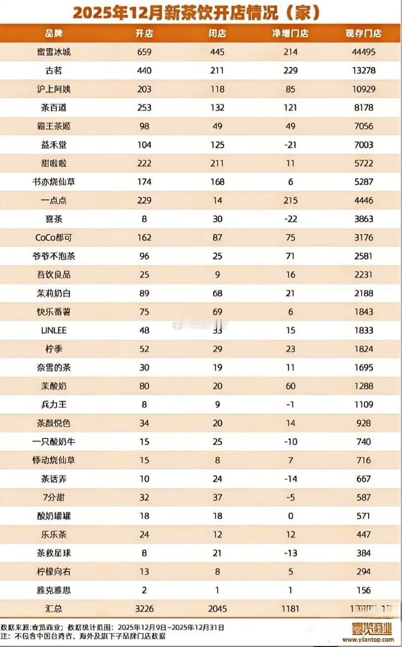 截至2025年12月,中国新茶饮赛道主流品牌开关店情况汇总。