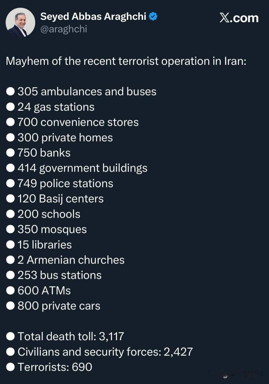 伊朗外交部长阿巴斯·阿拉格奇公布了从2026年1月1日—12日伊朗暴乱期间的财产损失和人员伤亡情况: 暴乱中遭受破坏的财产和场所: · 305辆救护车和公交车 · 24座加油站 · 700家便利店 · 300处私人住宅 · 750家银行 · 414座政府建筑 · 749个警察局 · 120个巴斯基民兵中心 · 200所学校 · 350座清真寺 · 15座图书馆 · 2座亚美尼亚教堂 · 253个公交车站 · 600台自动取款机 · 800辆私家车 此外,3,117人在本轮暴乱中丧生,其中2,427人为平民和安全部队人员,690人为暴乱分子。