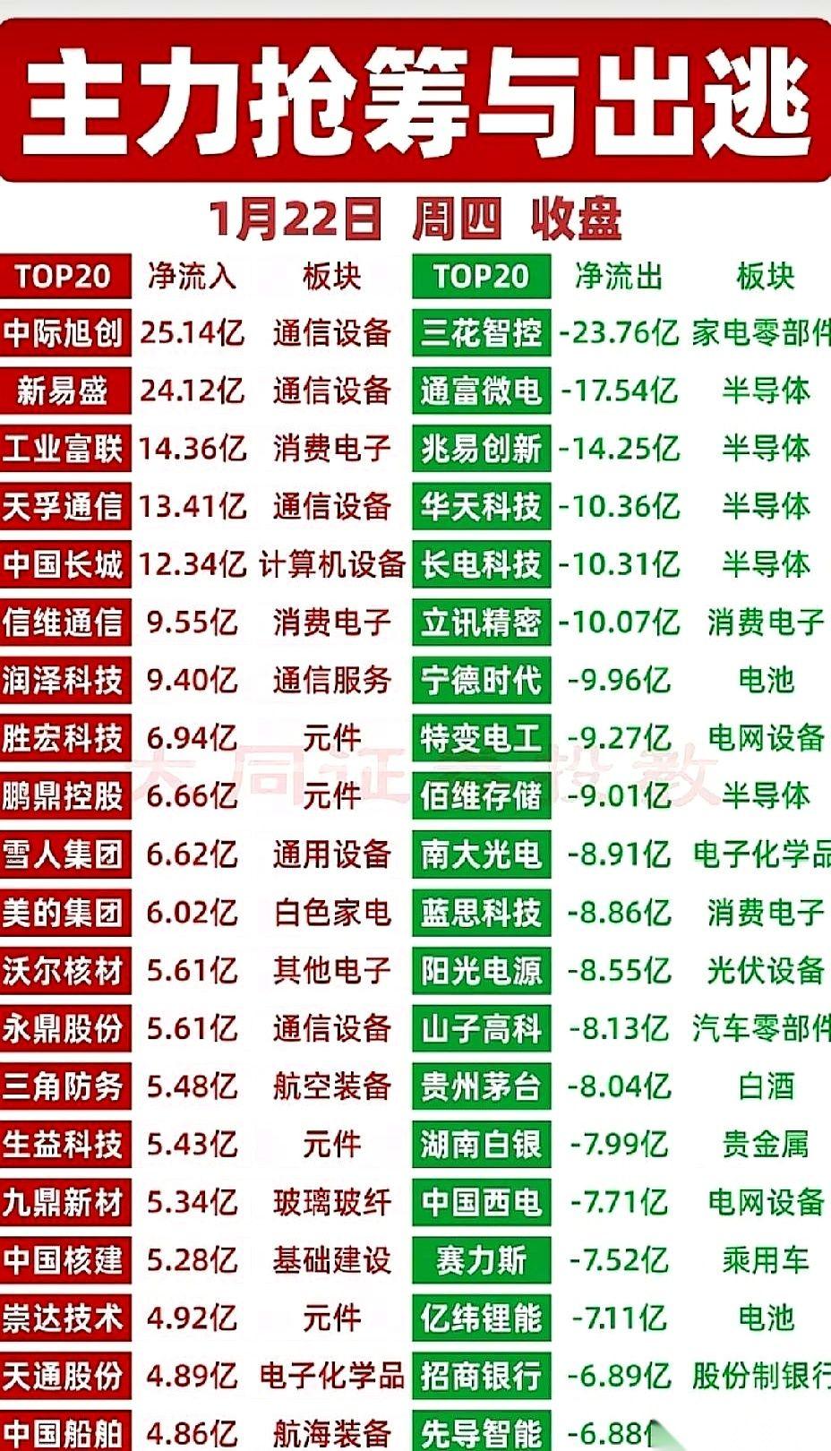 周四的A股,简直就是一出冰火两重天的大戏。 一边是资金疯了一样往里冲。中际旭创,25个亿,眼睛都不眨一下就砸了进去。新易盛那边,也紧跟着灌进去24个亿。工业富联更是被超过14亿的钱,硬生生把门给撞开了。 那架势,不像是买股票,倒像是饿狼扑食。 但另一边呢? 三花智控的场子,23个多亿的资金正连滚带爬地往外跑。通富微电更惨,将近18个亿,一夜之间就蒸发了,连个响儿都没听见。 就这么一天,几十亿的资金,像一条看不见的巨蟒,从这家公司悄悄溜走,又猛地扑向了另一家。 说白了,这哪是投资,这就是一场狩猎。你的盛宴,就建在他的残骸上。