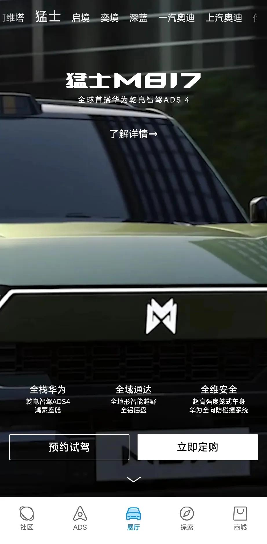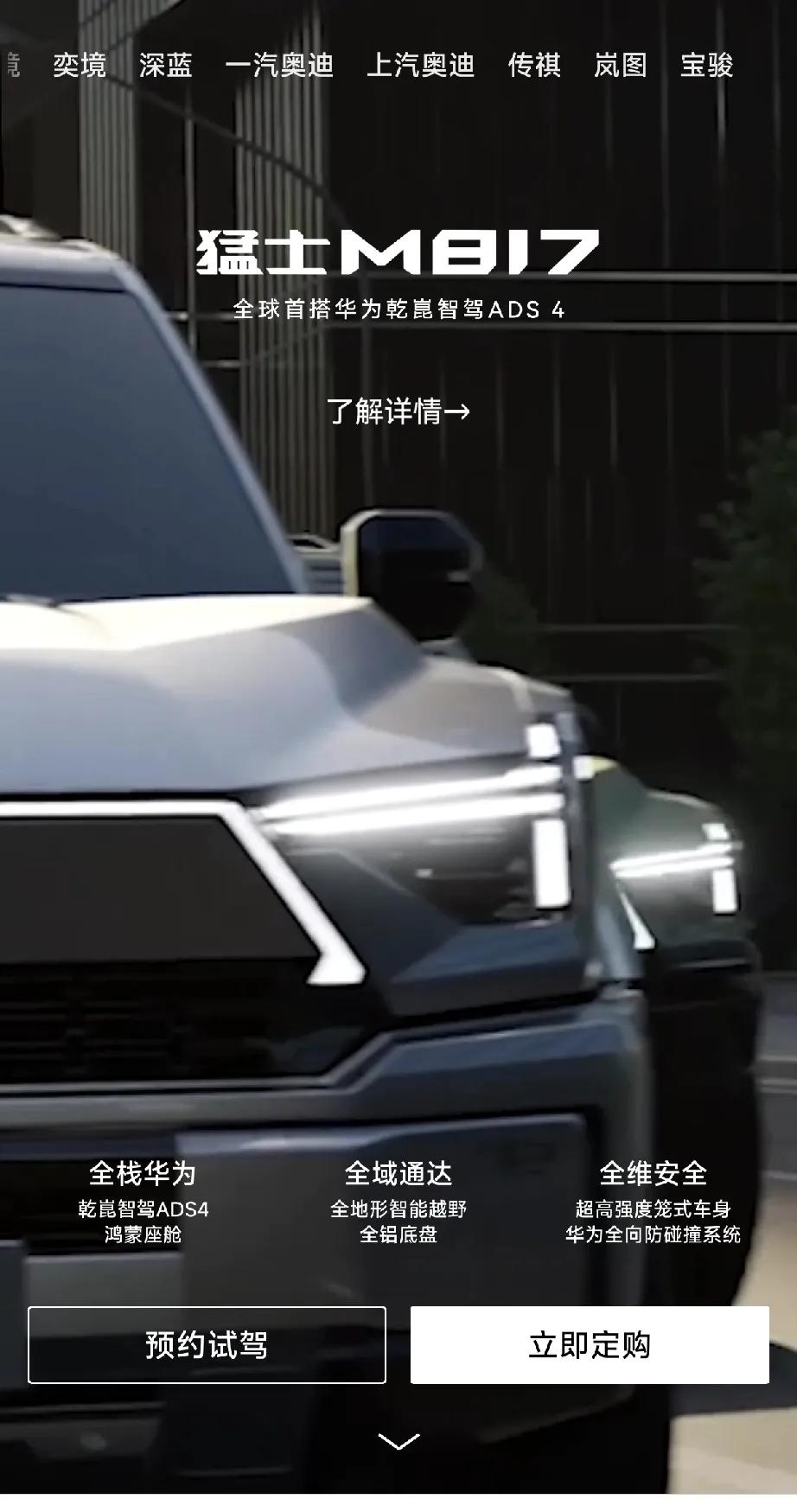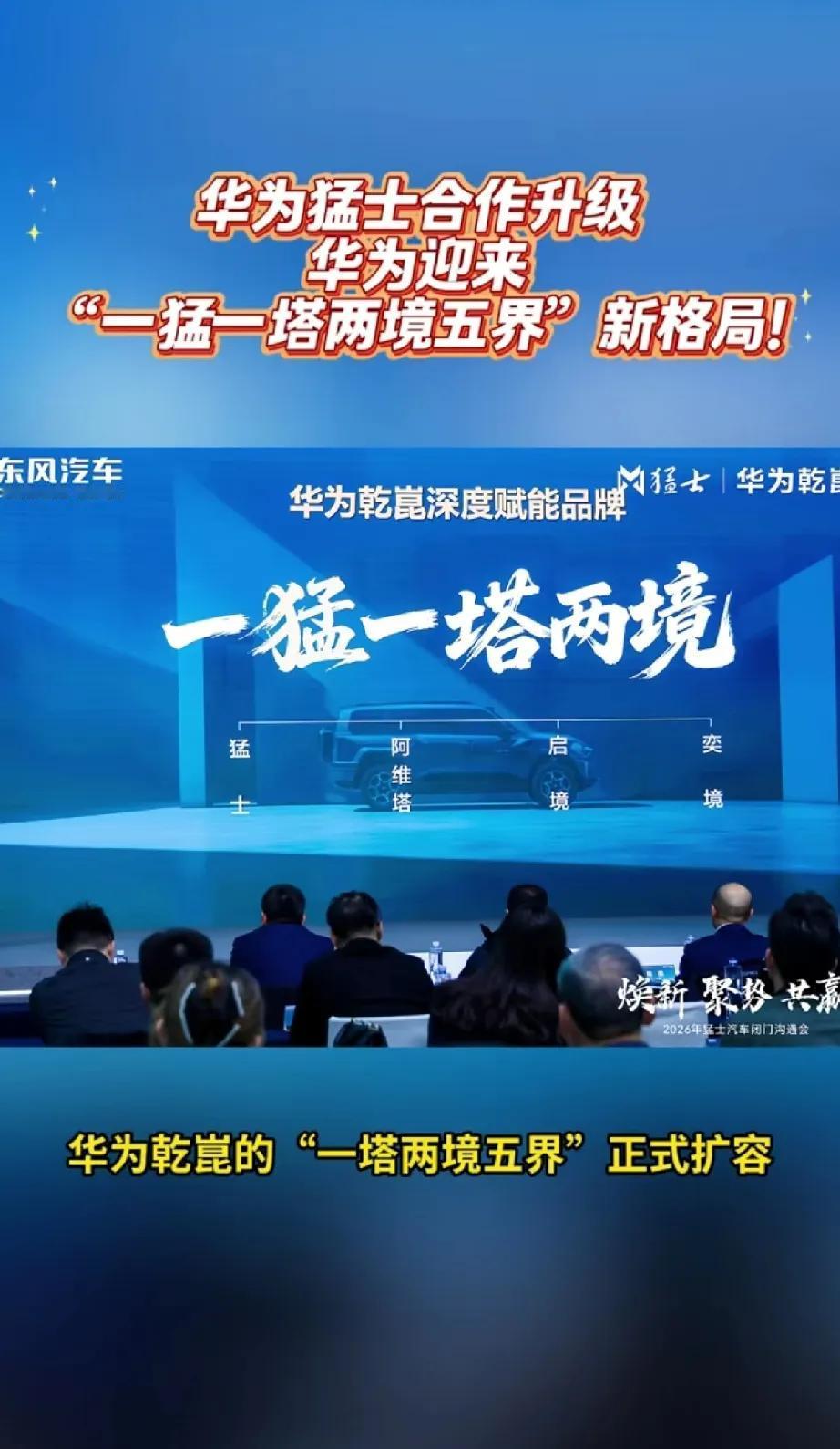 1月22日,以“焕新 聚势 共赢”为主题的2026年猛士汽车闭门沟通会在武汉低调举行。猛士汽车、华为乾崑核心管理团队以及猛士全国经销商代表齐聚一堂,共同擘画了未来合作的新蓝图。 华为乾崑“一猛一塔两境五界”的生态格局,也已日渐清晰。作为华为14家合作车企中唯一聚焦越野赛道的品牌,猛士汽车是华为乾崑生态的一块独一无二的拼图,填补了在硬派越野领域的空白;而猛士汽车则借助华为乾崑,实现了从新能源越野到智能越野的基因跃迁,牢牢占据了智能越野时代的技术和价值制高点。 华为乾崑深度赋能品牌——猛士、奕境、启境、阿维塔。没错,打开华为乾崑APP首先显示的就是这几个品牌。(下图7所示) 华为乾崑赋能品牌——(下图8所示)岚图、传祺、深蓝、一汽奥迪、上汽奥迪、宝骏……