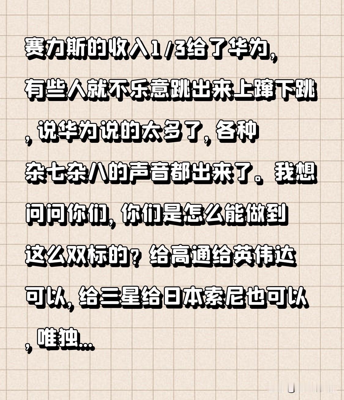 赛力斯的收入1/3给了华为,有些人就不乐意跳出来上蹿下跳,说华为说的太多了,各种杂七杂八的声音都出来了。 我想问问你们,你们是怎么能做到这么双标的?给高通给英伟达可以,给三星给日本索尼也可以,唯独给华为就不可以。你们这是什么心态呢? 我说句难听的,给了华为,华为还把钱留在国内,你给了三星、高通、英伟达这些,全部流向海外了。难道把钱流到海外去你们就很高兴了?