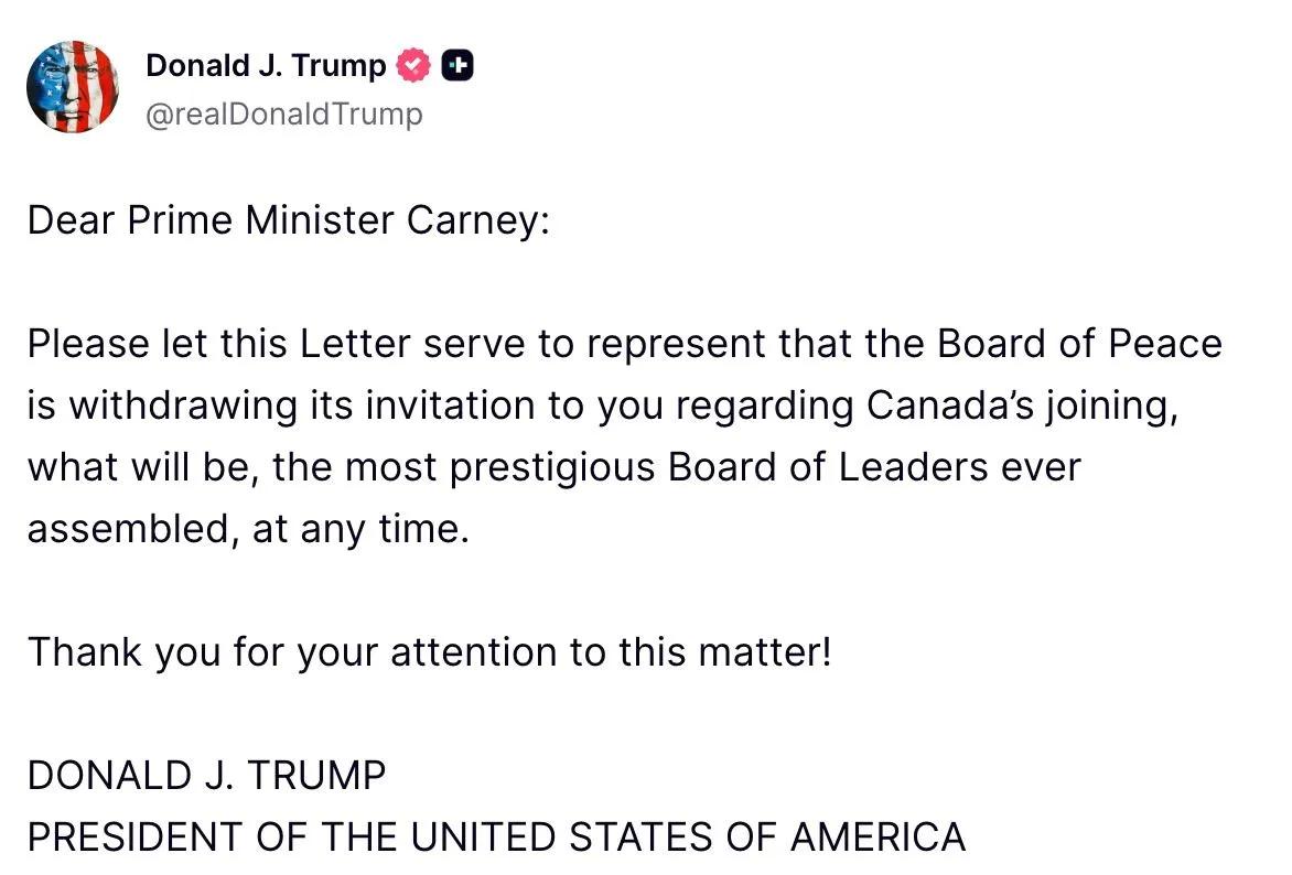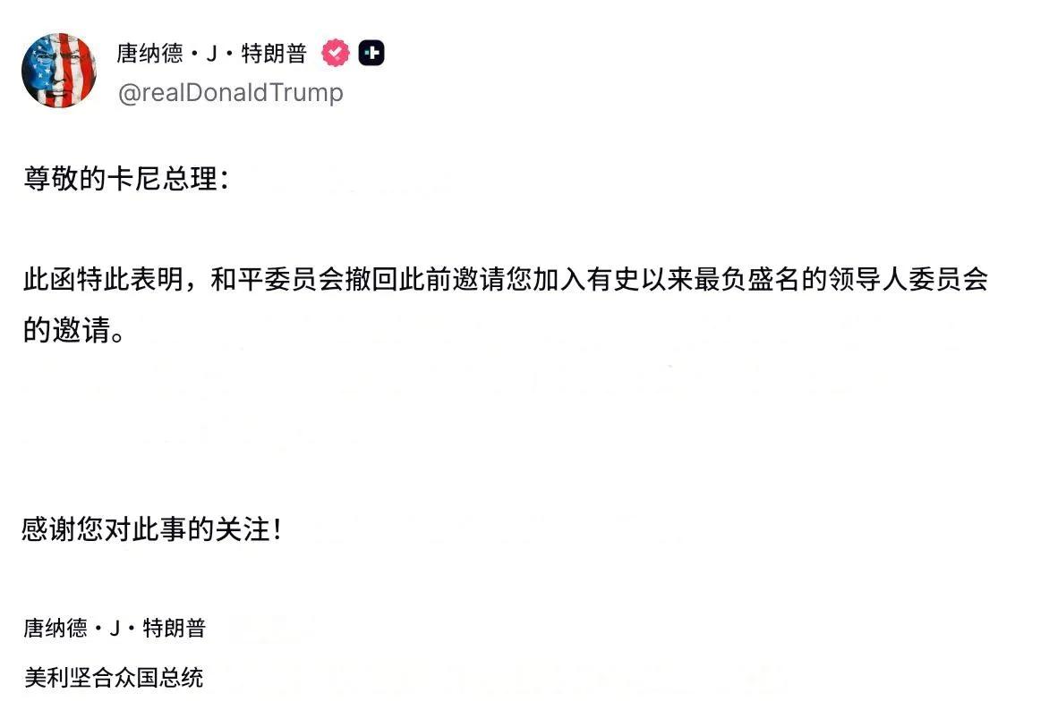 从达沃斯回到白宫后特朗普马上对加拿大总理卡尼说: “尊敬的卡尼总理: 此函特此表明,和平委员会撤回此前邀请您加入有史以来最负盛名的领导人委员会委员邀请。 感谢您对此事的关注!” 按华尔街日报1月23日说法,到目前为止,这个和平委员会的参与者只不过是一些热衷于讨好特朗普的国家,根本不是特朗普说的是一个杰出的领袖组织。 现在,就因为加拿大总理卡尼在达沃斯高度赞扬了中国,并暗示相比之下特朗普治下美国将江河日下,结果就是看到的,特朗普回到华盛顿第一件事就是收回已经向卡尼发出的加入这个“杰出领袖组织”的邀请,以示对他的报复。 或许,此时的卡尼正在为找不到一个拒绝特朗普邀请的理由而烦恼,而特朗普对他的报复成了他退回邀请最好的理由。 看吧,很快,卡尼就将对此做出反应以感谢特朗普送给他的这份深情厚意。