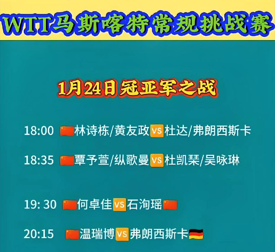 国乒女队终于迎来了2026年第一个冠军, 虽然只是个小比赛, 但是也是个好的开始。 马斯喀特常规赛, 女单何卓佳和石洵瑶会师决赛。 太不容易了, 国乒女队终于迎来2026年第一个冠军, 这也是一个好的开始, 希望国乒从此一帆风顺。 这次女单会师, 男单没会师。 上次是男单会师, 女单没会师, 希望下次看到男单、女单都会师。 另外今天看点还有男双、女双以及男单, 男双林诗栋/黄友政, 女双覃予萱/纵歌曼, 温瑞博对战佛朗西斯卡。 希望左边的都赢, 许温瑞博一个冠军, 许林诗栋一个冠军, 许何卓佳一个冠军, 许覃予萱一个冠军, 希望国乒这次多拿几个冠军。 (图片源自于网络)