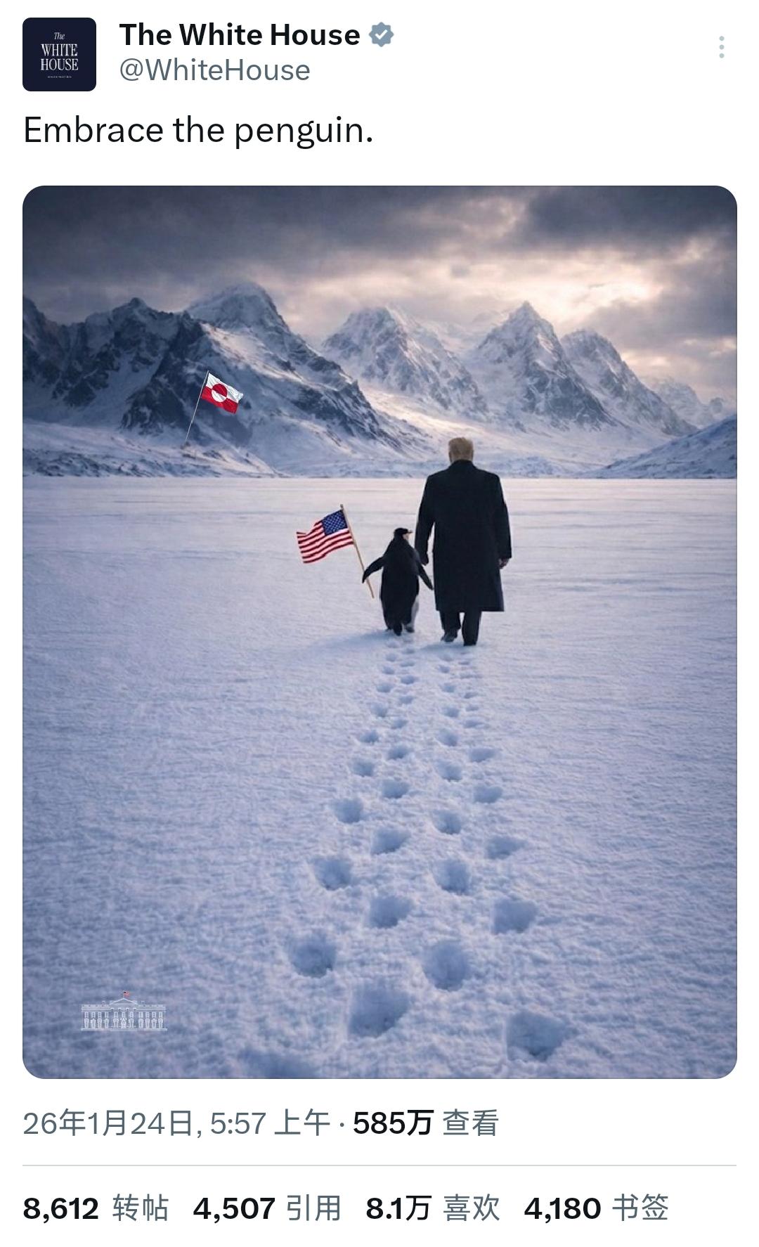 1月24日,美国白宫的官方社交媒体账号,发布了一张照片,再次展现出了美国对格陵兰岛的领土野心。但仔细看一下,会发现这张照片当中有不小的问题。 首先,最大的常识性错误就是,格陵兰岛包括北极是没有企鹅的,应该是北极熊才对。因此图片当中,特朗普和企鹅拿着美国国旗,就显得非常的奇怪。 不过我又开始怀疑,这张图片是否另有深意,标志着特朗普又开始对南极有想法,希望去占领南极了呢?但不远处那个格陵兰岛的官方旗帜又再次证明了,这个地方就是格陵兰,而并不是南极。这似乎只能说明白宫的社交媒体负责人是一个草台班子,连南极和北极的代表性动物都分不清。 不过话又说回来,从特朗普的西半球优先战略出发,也并不能排除特朗普未来会对南极提出主权诉求。由于南极本质上是一个全球公地,而且受1959年的《南极公约》所管理,美国也是这个公约的签约国。未来特朗普如果想占据南极,有可能会宣布退出这个公约,并且在南极进行领土占领以及资源的单方面开采。