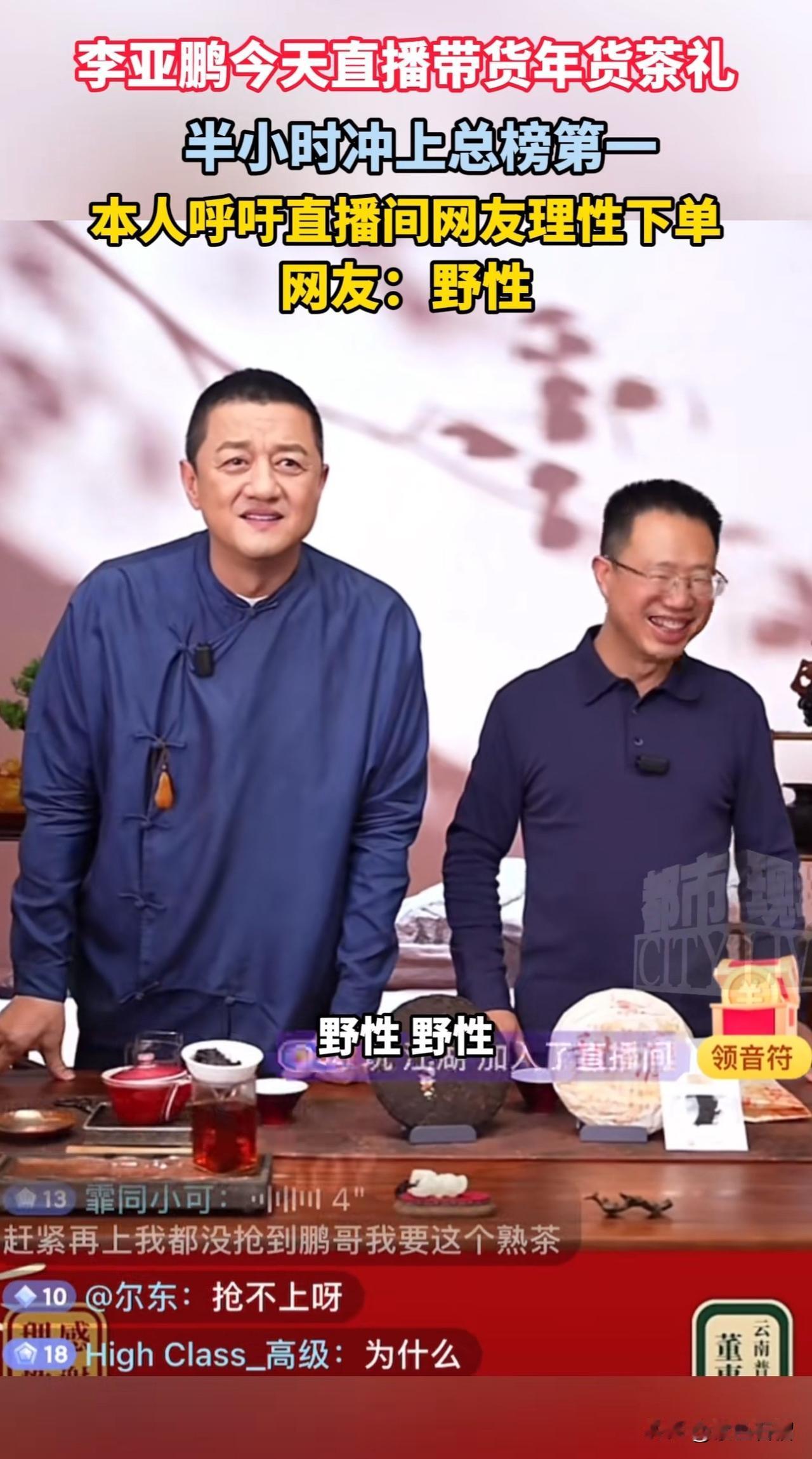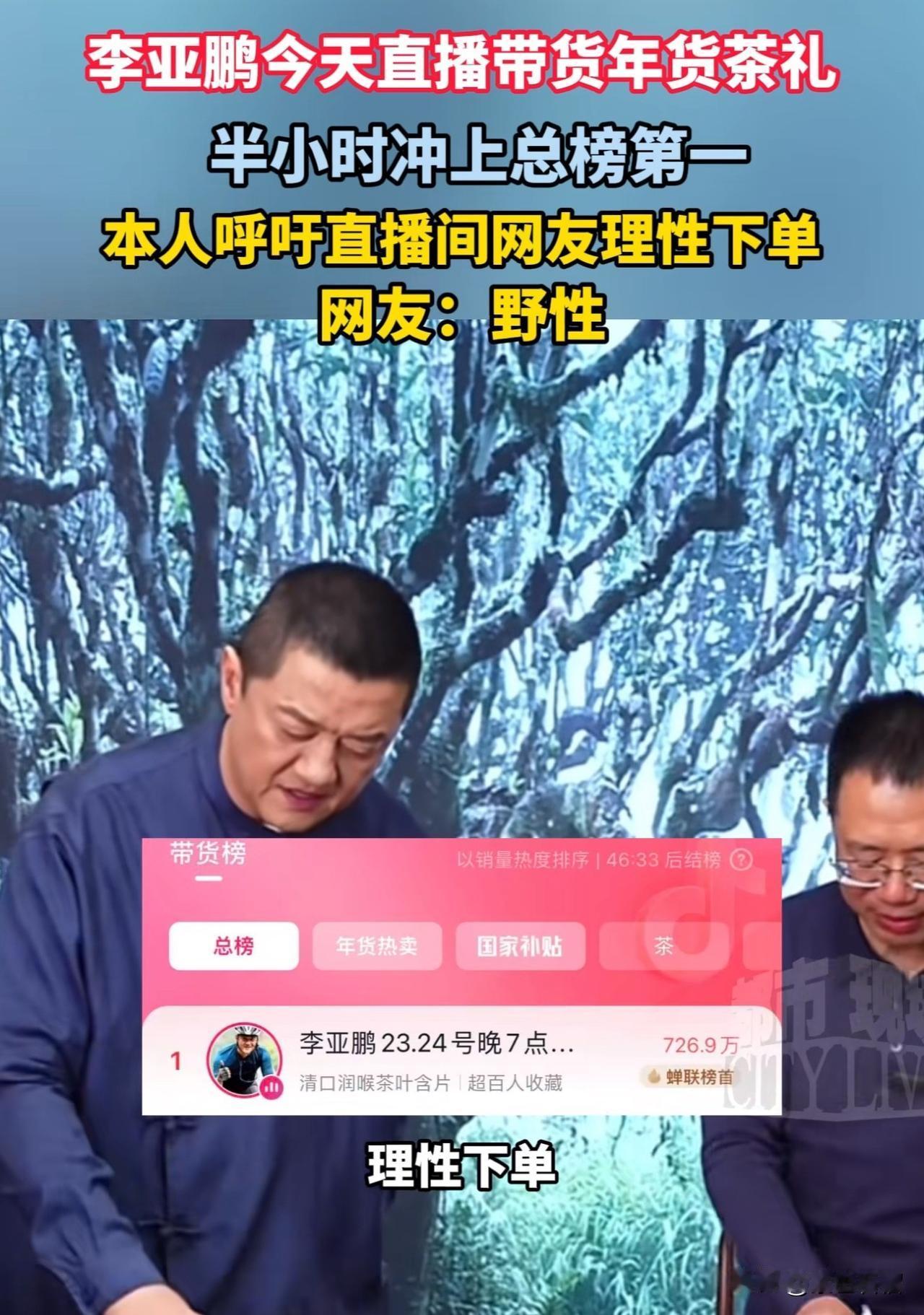 李亚鹏的事让我们真切明白了什么叫得民心者得天下。 昨天李亚鹏开启直播,没过多久,直播间就涌入了10万人。直播还不到一小时,便登上了直播总榜首位。李亚鹏刚打算介绍直播的产品,涌进来的网友直接喊道:别介绍了,直接上小黄车。仅仅一秒不到,小黄车里的商品就被抢购一空。 李亚鹏卖茶叶,爱喝茶的和不爱喝茶的都下单了。有网友表示,哪怕只喝一口就扔掉也要下单。一位女士称:我自己不喝茶,也要给我老公拍一单。 李亚鹏呼吁大家理性消费,网友则直接回应:我就要野性消费、野性消费。 我也是第一次真正见识到了民心所向的含义。 说白了,咱老百姓的心才最敞亮。 (图片来源网络)