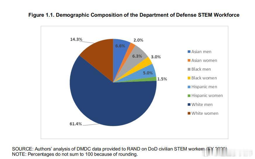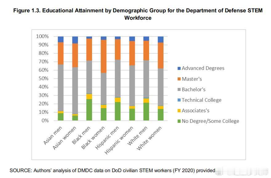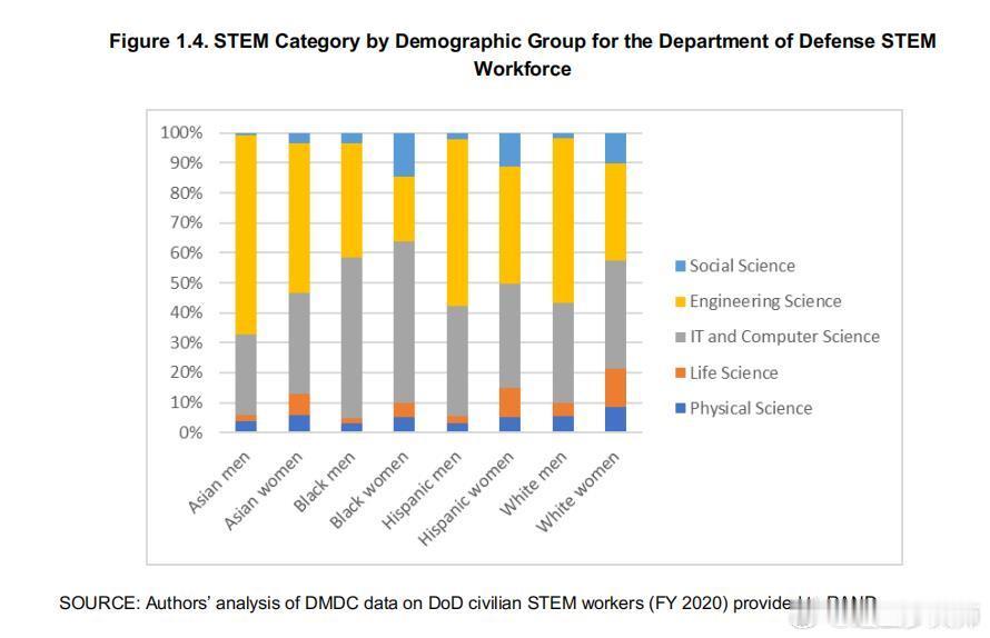 亚裔女在美军STEM(理工科)岗位上的比例远超人口比例?📍根据美国著名智库兰德的报告,是亚裔男6.6%+亚裔女14.3%=20.9%。亚裔在美国人口总数约7%。结果亚裔男和这个占比持平,亚裔女却这么喜欢参加美军??(图1)(之前验证牢A关于美军的说法,有个亚裔在美军STEM岗里我写错了。)📍再看美军中的STEM岗位亚裔学历(图2)灰色开始是大学学历,再往上是硕士、博士及以上,亚裔学历远远领先于其它其它族裔。📍美军中的STEM岗位亚裔男近70%是工程科学岗位。所以牢A说美军征兵官看见亚裔男就说,你去改学工程学,加入美军就给你各种优惠条件。这其实就是根据美军现状来的。参考文献:RAND. Demographic Diversity of the Science,Technology,Engineering,and Mathematics(STEM)Workforce in the U.S.Department of Defense.
