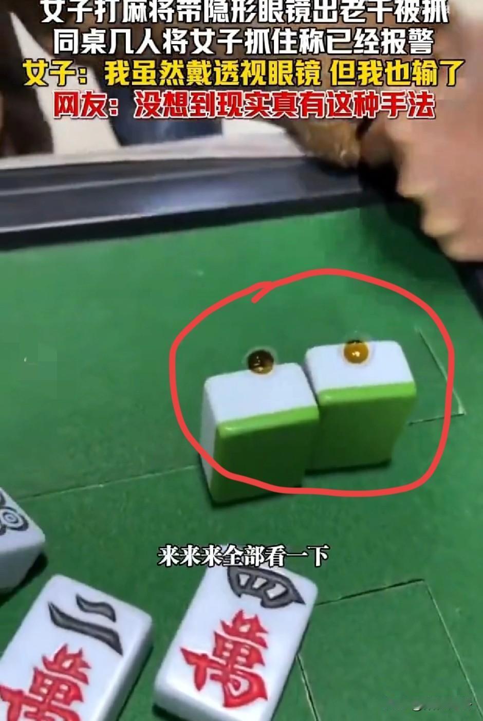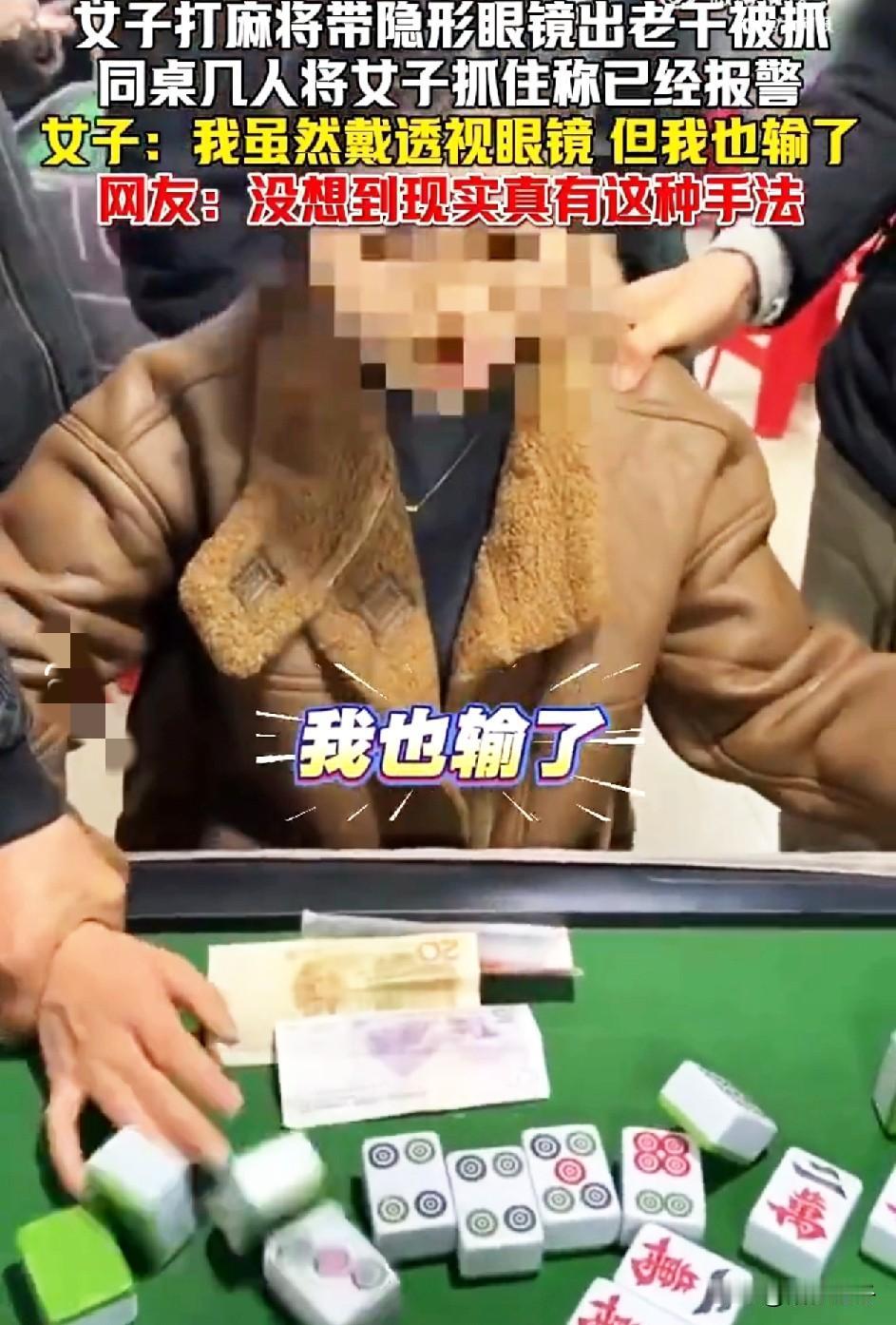 女子戴透视隐形眼镜打麻将被抓![捂脸] 真服了出“老千”还能输钱,现场被抓,几名牌友将其控制,硬生生的把隐形眼镜取了出来,没想到电影里的剧情在生活中上演了! 1月23日,据网友爆料,一名中年女子在打麻将时佩戴“隐形透视眼镜”被同桌识破现场抓住。 几人气愤不已指责中,女子被控制,一名男子上前用手把佩戴的隐形眼镜取了出来作为证据,并已经报警处理,女子委屈的辩解到:“虽然作弊,但我也输钱!”[捂脸] 看着桌子上的人民币面值都在5元、10元左右输赢应该不是太大,真没必要“出老千”关键还没赢钱! 本人好奇的是“出老千”固然不对,但是赌博好像也是犯法的,女子受到惩罚,那同桌一起打麻将的人,会不会被处罚呢? 大家对此怎么看?摘戴隐形眼镜 打麻将