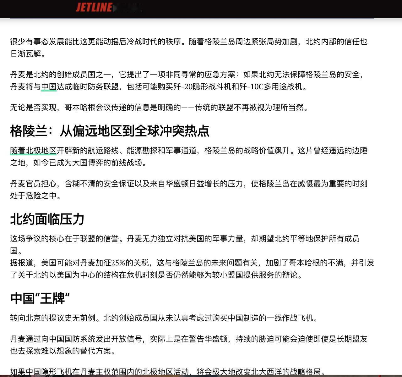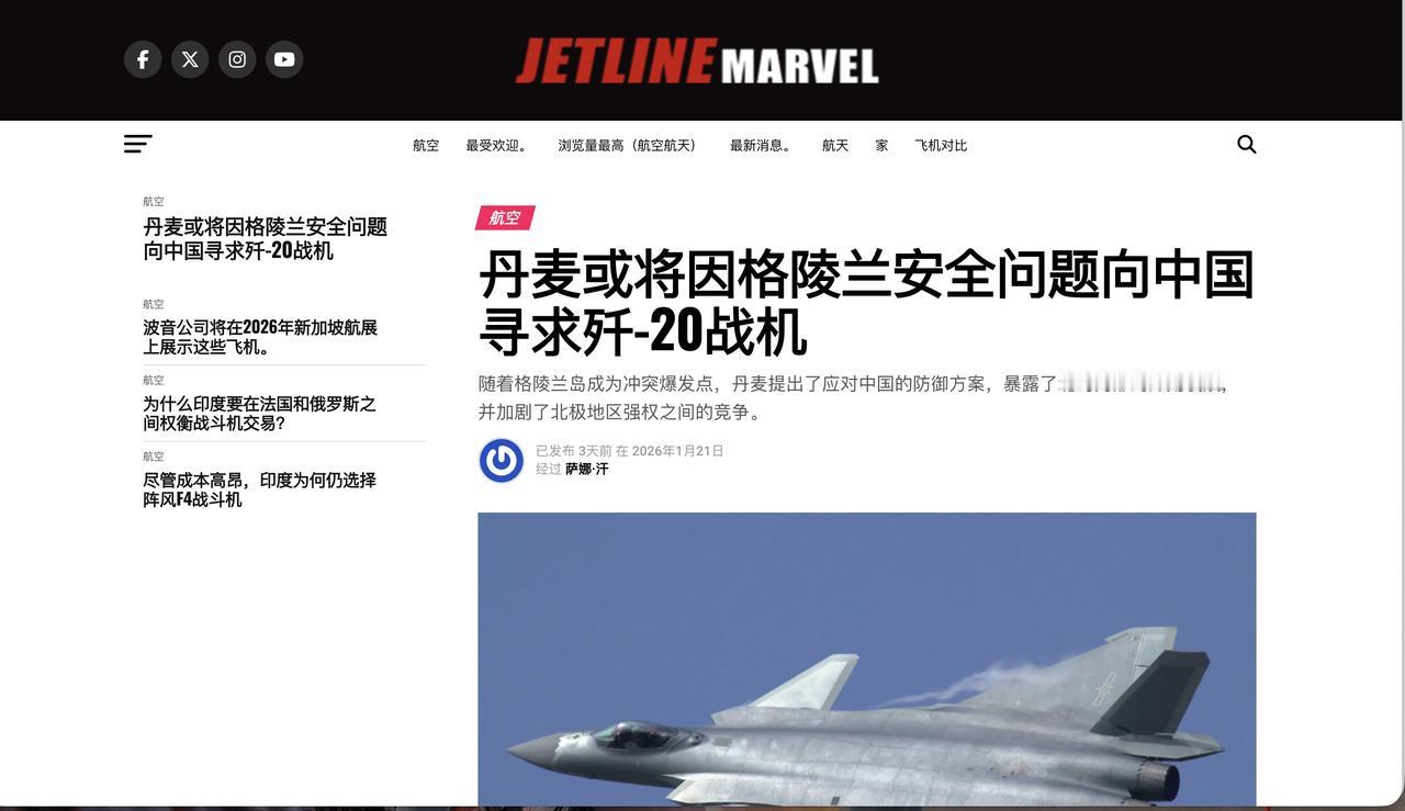 据印度媒体“Jetline Marvel”网站报道,如果北约(NATO)无法保障格陵兰岛安全,丹麦可能转向与中国进行防务合作,包括考虑购买中国的歼-20隐形战斗机和歼-10C多用途战机。 印度那边可以意淫一下,但这事绝对不可能。 丹麦一贯强调北约框架下的防务合作,就在美国要强硬拿下格林兰岛之时,丹麦在1月份照样向美国采购武器。 而且,歼20是中国的王牌战机,是不对外出口的。