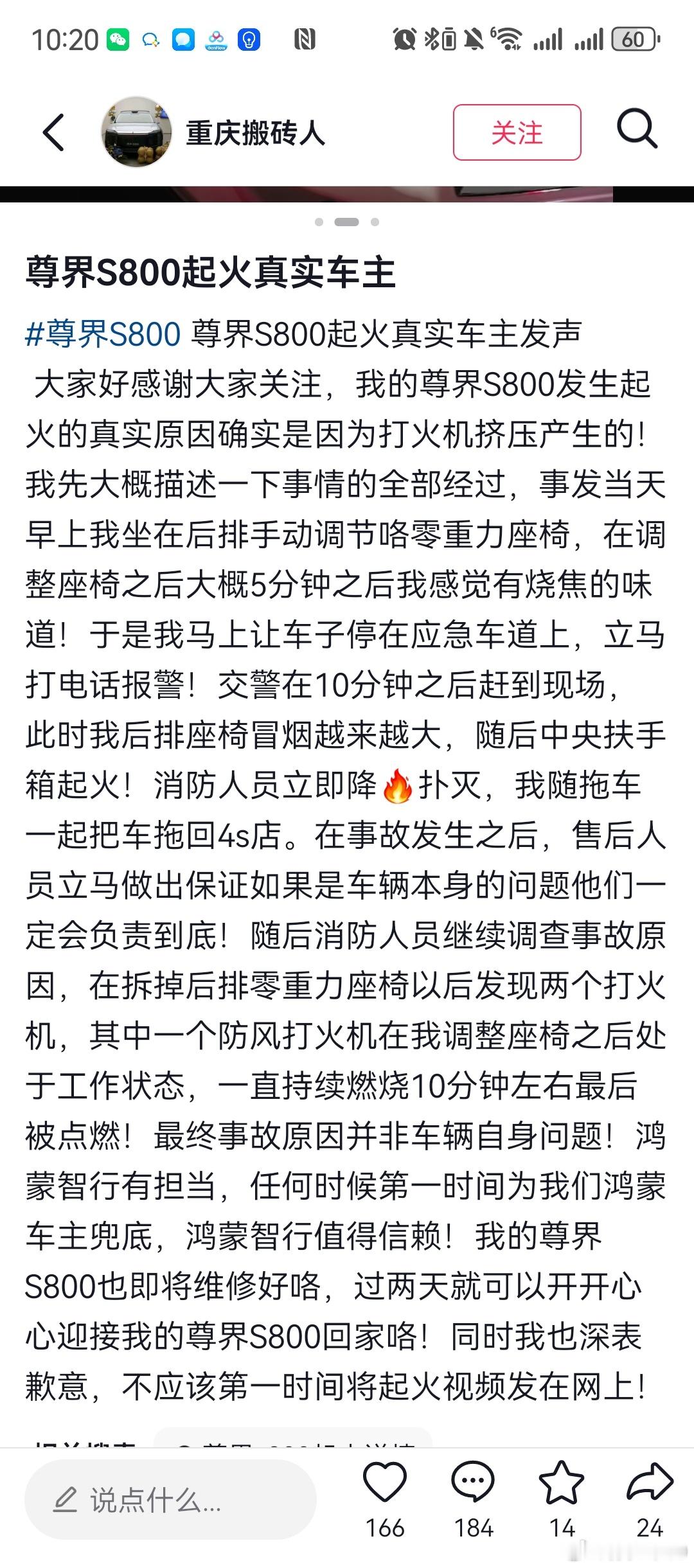 前几天的尊界S800后排座椅着火,车主自己晒出调查认定书,说了来龙去脉。就是防风打火机,而且还是两个,其中一个处于工作状态10分钟左右最后把座椅点燃。这么看,反而证明尊界S800防火性能还可以。尊界S800:你才是真活爹啊