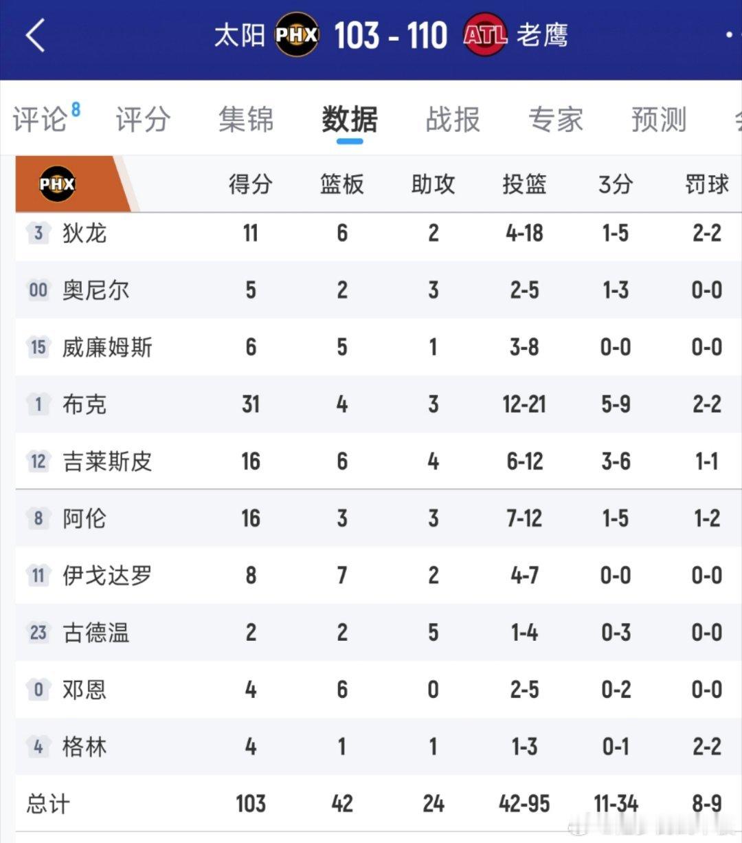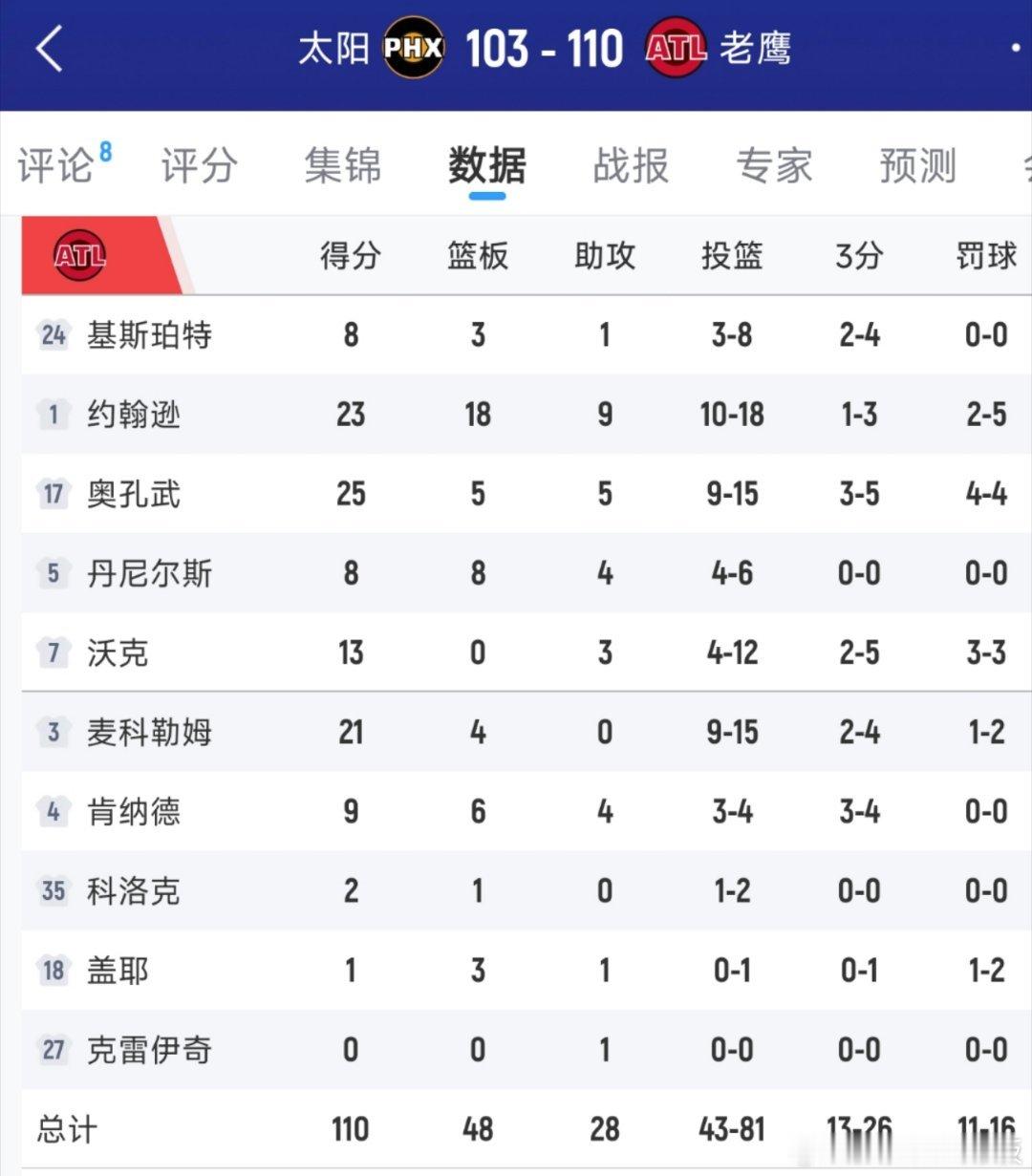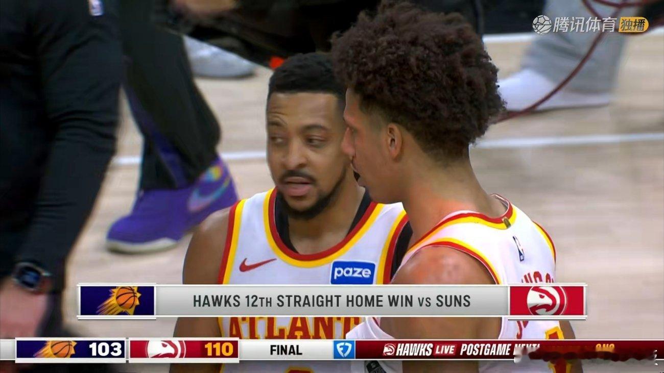 布克&杰伦-格林伤退,太阳末节崩盘103-110不敌老鹰。湖人凭借胜率优势,重新升至西部第5!太阳连续12个赛季未在亚特兰大赢球,布克31分,狄龙11分18中4;杰伦-约翰逊23分18板9助太阳vs老鹰