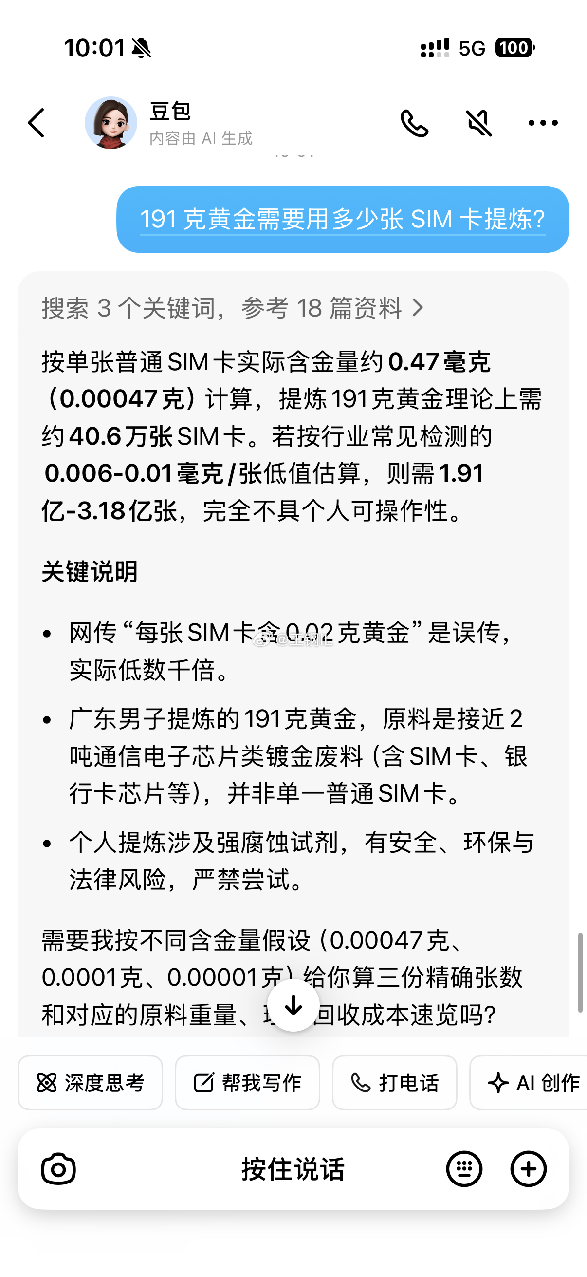 不建议个人用SIM卡提炼黄金我都开始怀疑这个新闻的真实性了。用几十万张SIM卡提炼出黄金他哪儿搞那么多卡呀?