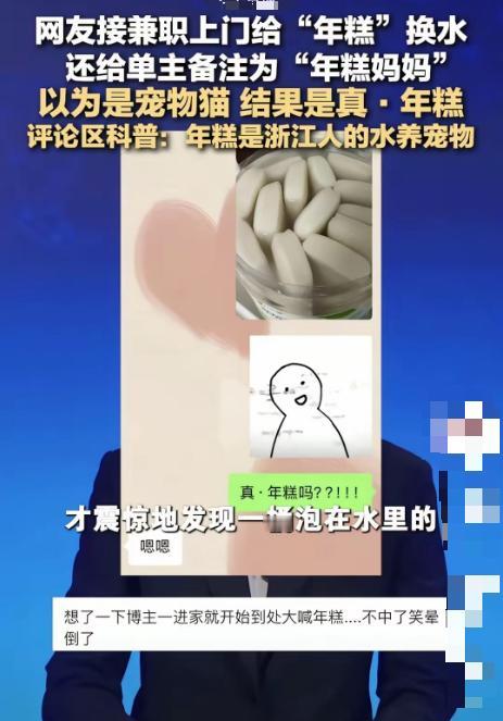 “笑不活了!”浙江,一女子接了个“兼职”,需要上门给“年糕”换水,一次30元,起初,女子还以为“年糕”是某种宠物的外号,甚至还在微信上专门备注了“年糕妈妈”。没想到,上门一看才发现是真年糕!网友:年糕是浙江人的“水养宠物”! 浙江杭州的一名女子像往常一样刷着兼职平台,突然看到一则很特别的兼职信息,内容很简单,就是上门帮忙给“年糕”换水,每次服务费30元,时间灵活,不用耗费太多力气,只要按时上门,把水换好就行。 看到这里,女子立马动了心,30块钱一次,操作简单还不费力,这样的兼职简直是“躺赚”。只是看到“年糕”这两个字时,女子心里犯了点嘀咕,她从来没听说过,换水还能和年糕扯上关系。结合自己以往接兼职的经验,女子下意识就以为, “年糕”应该是某种水养小动物的外号,就像有些人会给宠物取名“汤圆”“包子”一样,大概率是金鱼、乌龟之类的小宠物,主人没时间照顾,才找人上门换水。 越想越觉得合理,女子没再多问,立马联系了发布兼职的雇主,敲定了上门时间和具体事宜,还悄悄在心里备注,一定要细心点,别把雇主的“小宠物年糕”照顾不好。 她甚至提前脑补了一下,“年糕”说不定是一条可爱的小金鱼,或是一只乖巧的小乌龟,还特意准备了干净的抹布,想着换水时顺便把容器擦一擦。 到了约定的时间,女子按时出发,按照雇主给的地址,顺利找到了小区和楼栋,可走进厨房,环顾一圈,女子彻底懵住了,厨房里压根没有什么水养宠物,没有鱼缸,也没有乌龟缸, 只有一个大大的塑料盆,盆里装满了清水,而清水里泡着的,竟然是几块白白胖胖、实打实的年糕,没有任何小动物的影子。 女子愣在原地,半天没反应过来,反复确认了好几遍,才敢相信自己的眼睛——原来雇主说的“年糕”,不是什么水养宠物的外号, 就是我们平时吃的那种年糕,她费心脑补的小宠物,竟然是一堆能吃的食物,那种落差感,让她一时之间不知道该哭还是该笑。 雇主看出了她的疑惑,笑着解释了几句,女子这才明白,原来在浙江,很多人家过年都会囤不少年糕, 而年糕想要保持软糯的口感,不能冷冻、不能敞放,也不能密封,最正确的做法就是用清水浸泡,还要定期换水,不然水会变浑浊,年糕也会发霉变质,口感变得硬邦邦的,没法吃了。 雇主平时工作太忙,加上最近要出门几天,没时间给年糕换水,又担心年糕变质浪费,就想着找个兼职帮忙,这才有了这则特别的兼职信息。 女子听完后,哭笑不得,原本以为是照顾小宠物,没想到竟是给年糕换水,虽然有点意外,但还是按照约定,仔细给年糕换了干净的水,还轻轻搅动了几下,防止年糕粘在一起。 换完水,雇主当场给她结了30元服务费,女子拿着钱走出雇主家,越想越好笑,就把自己接兼职闹的这个笑话,拍了段短视频发到了网上,还配文吐槽自己的脑补行为。没想到,这段视频很快就火了,引发了全网网友的热议,播放量一夜之间突破百万。 女子也表示,虽然闹了笑话,但也长了见识,以后再看到类似的兼职,一定先问清楚,不会再随便脑补了。 对此,你们有什么看法,欢迎评论留言~