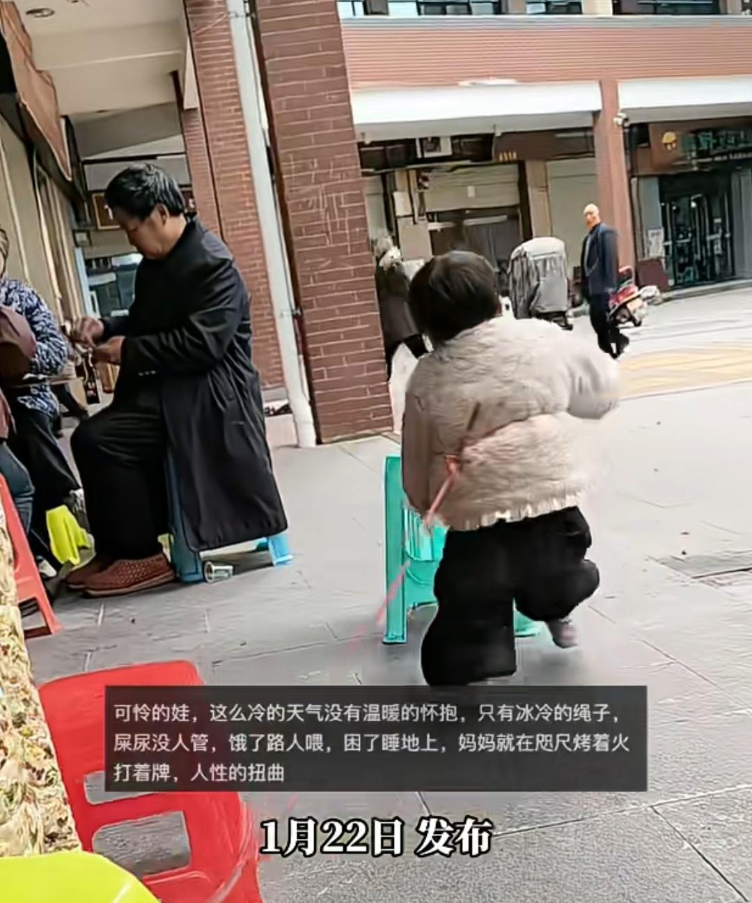 妈妈为了打牌把孩子绑在门口,饿了路人喂,困了就睡地上,能活动的范围只有绳子的长度。有网友评论,妈妈不负责,爸爸也死了,真可怜,跟她一起打牌的也没有好人。