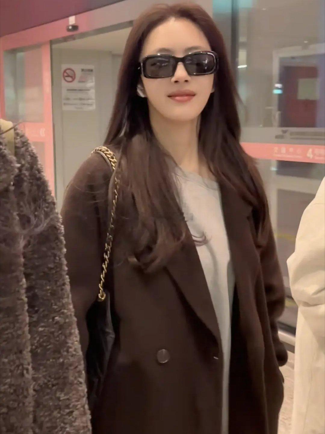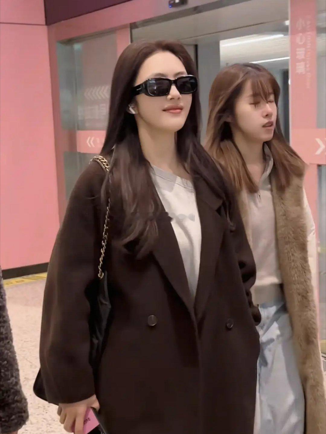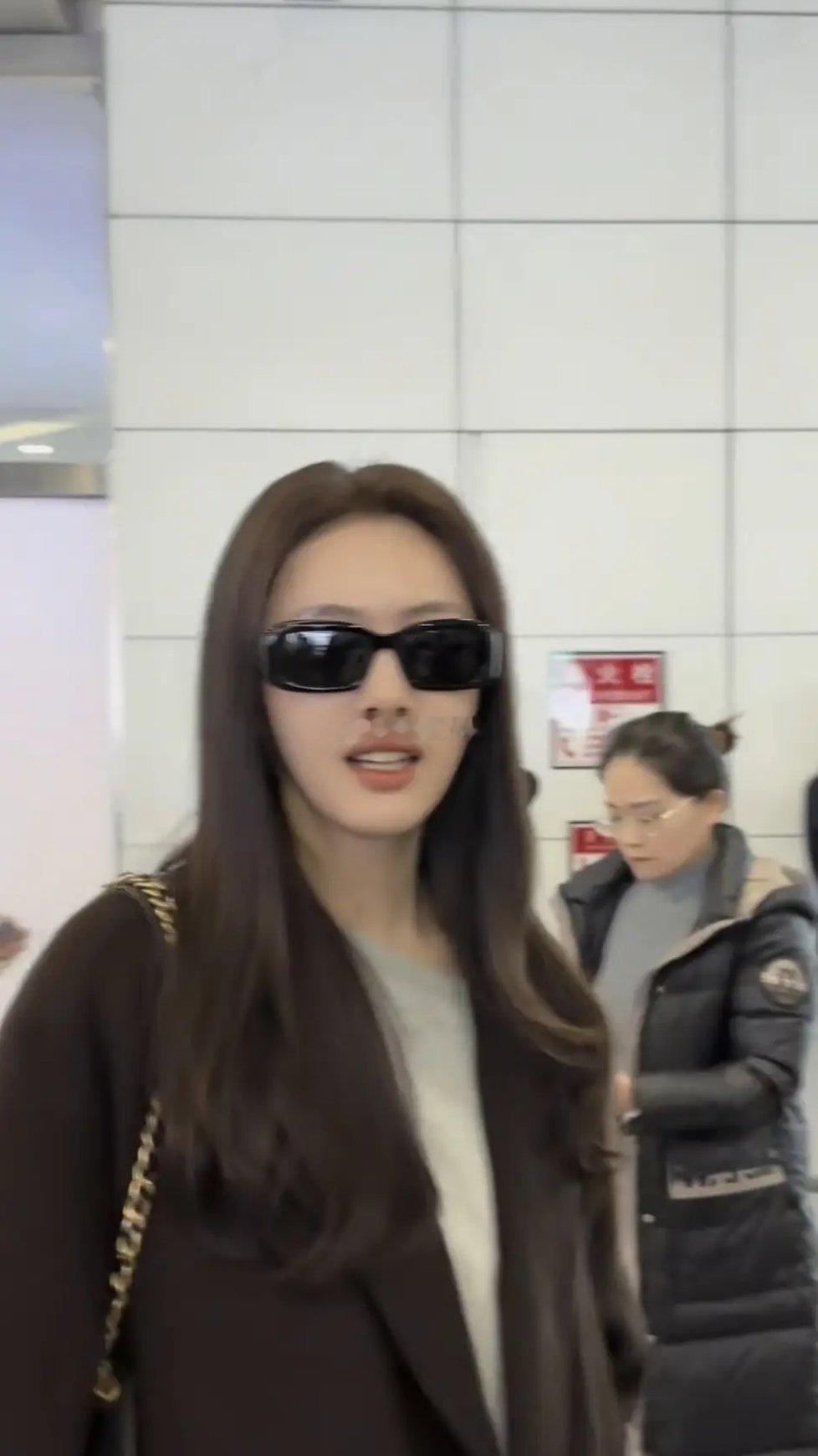 蔡文静机场造型亮眼,大衣配短裙靴子飒气十足,肌肤白皙透亮,状态绝佳,行走间气场全开,每一步都透着利落与美感。