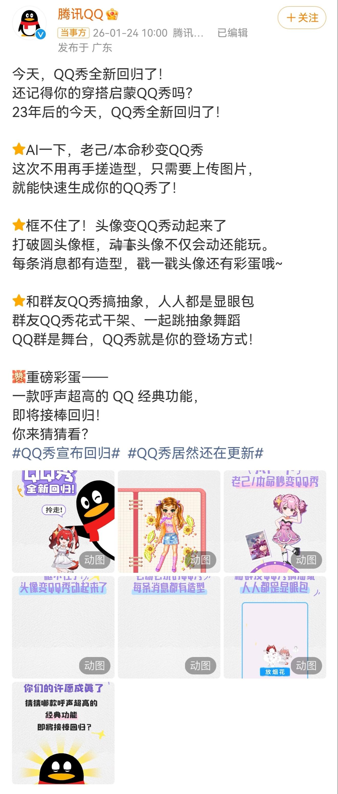 QQ秀宣布回归 青春回来了!QQ秀这次还支持AI创造专属形象,QQ头像也可以变成动态QQ秀小人,感动 大家当年玩过QQ秀吗?回归后要不要再玩一下