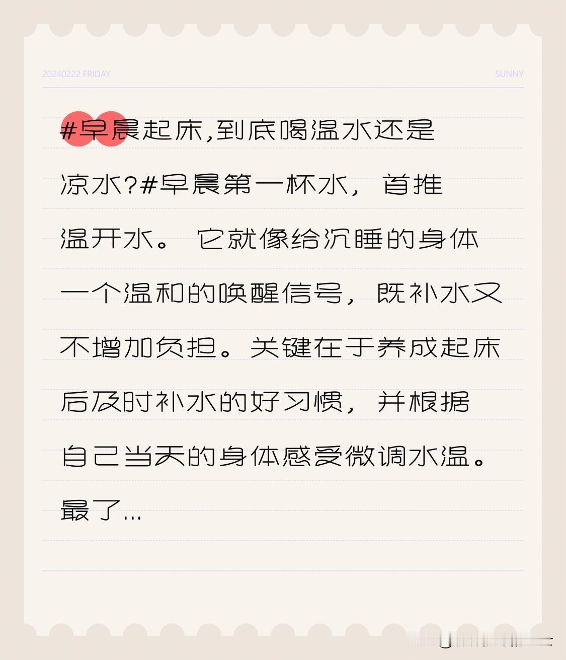 早晨起床,到底喝温水还是凉水?早晨第一杯水,首推温开水。 它就像给沉睡的身体一个温和的唤醒信号,既补水又不增加负担。关键在于养成起床后及时补水的好习惯,并根据自己当天的身体感受微调水温。 最了解你身体的是你自己,如果喝凉水后感觉精神焕发且肠胃无任何不适,那也未尝不可。但如果你不确定,从温水开始总是最稳妥的。早上喝温水好处 早起喝水禁忌