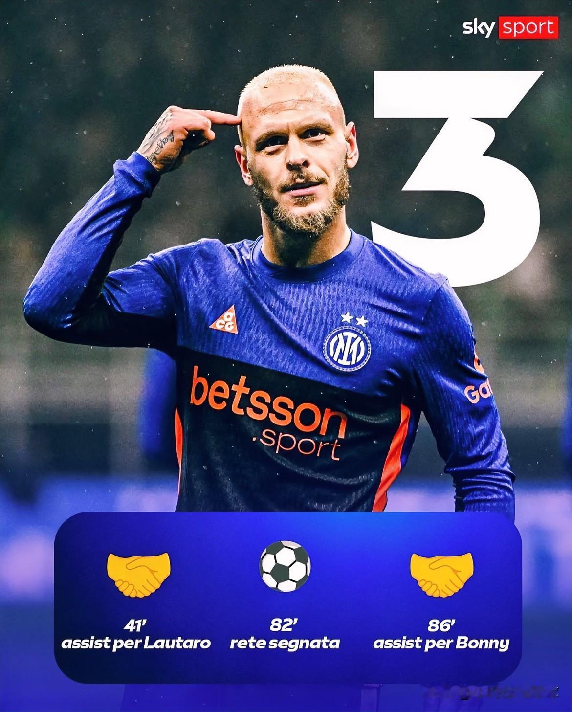 里程碑时刻!天空体育:替补登场独造三球,国米第一人! 迪马尔科在球队落后两球的情况下,第34分钟紧急替补出场,并在几分钟后送出助攻:助劳队打入扳平进球;下半场,蓝黑太子火力不减:凌空斩破门、助攻博尼破门。 这是自数据统计可用以来(04/05赛季起),第一位在单场意甲比赛中:参与三球的国际米兰后卫!