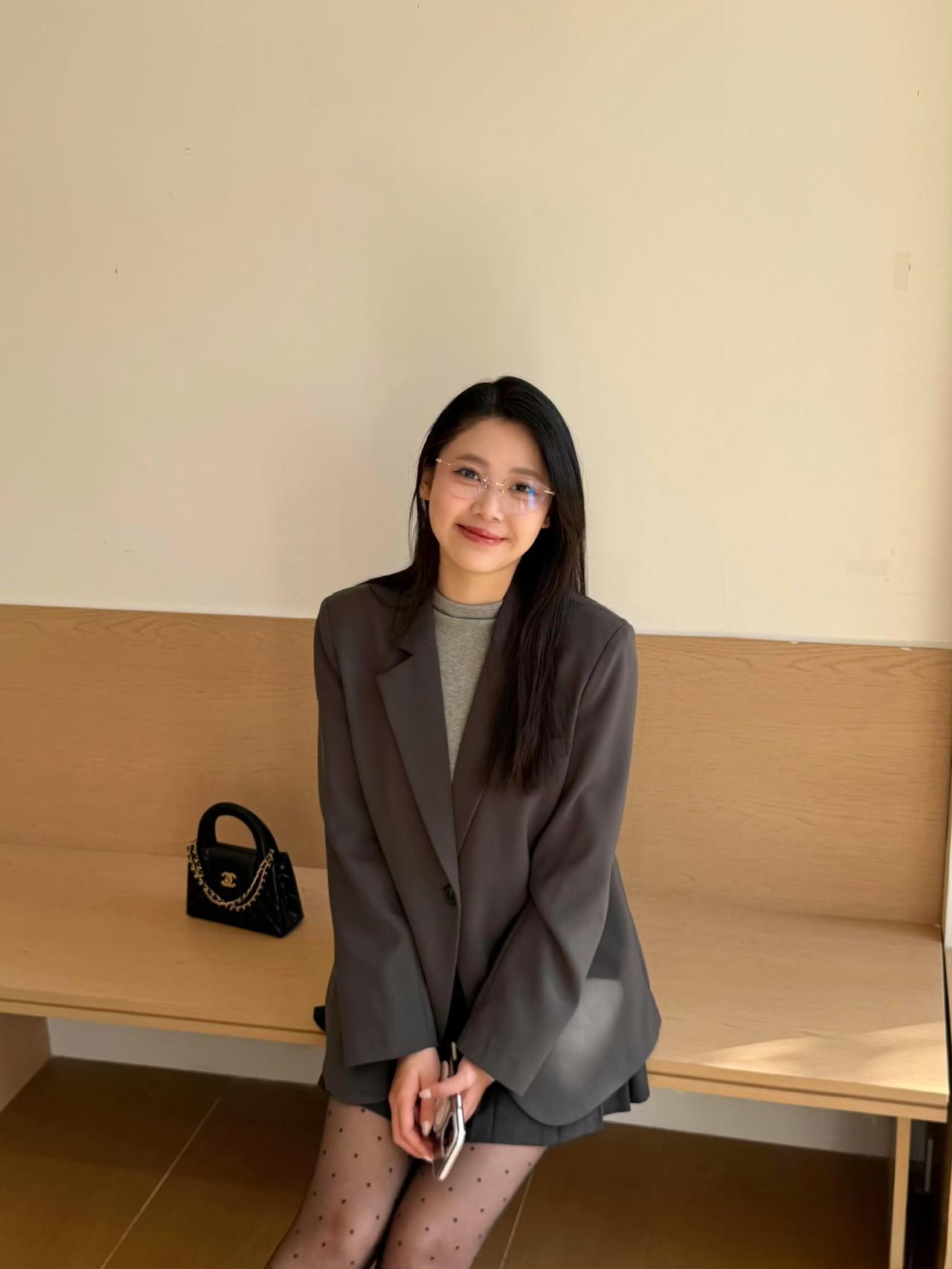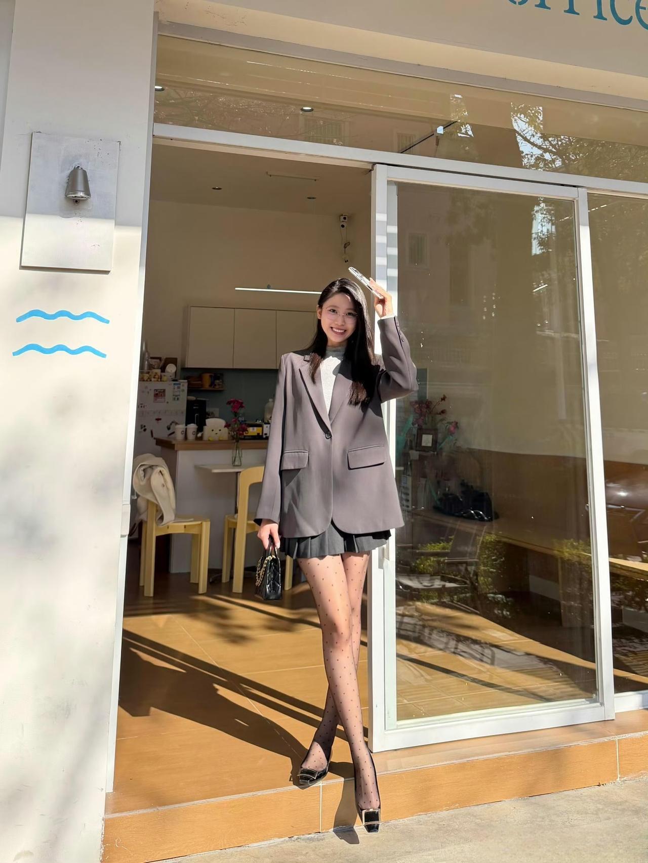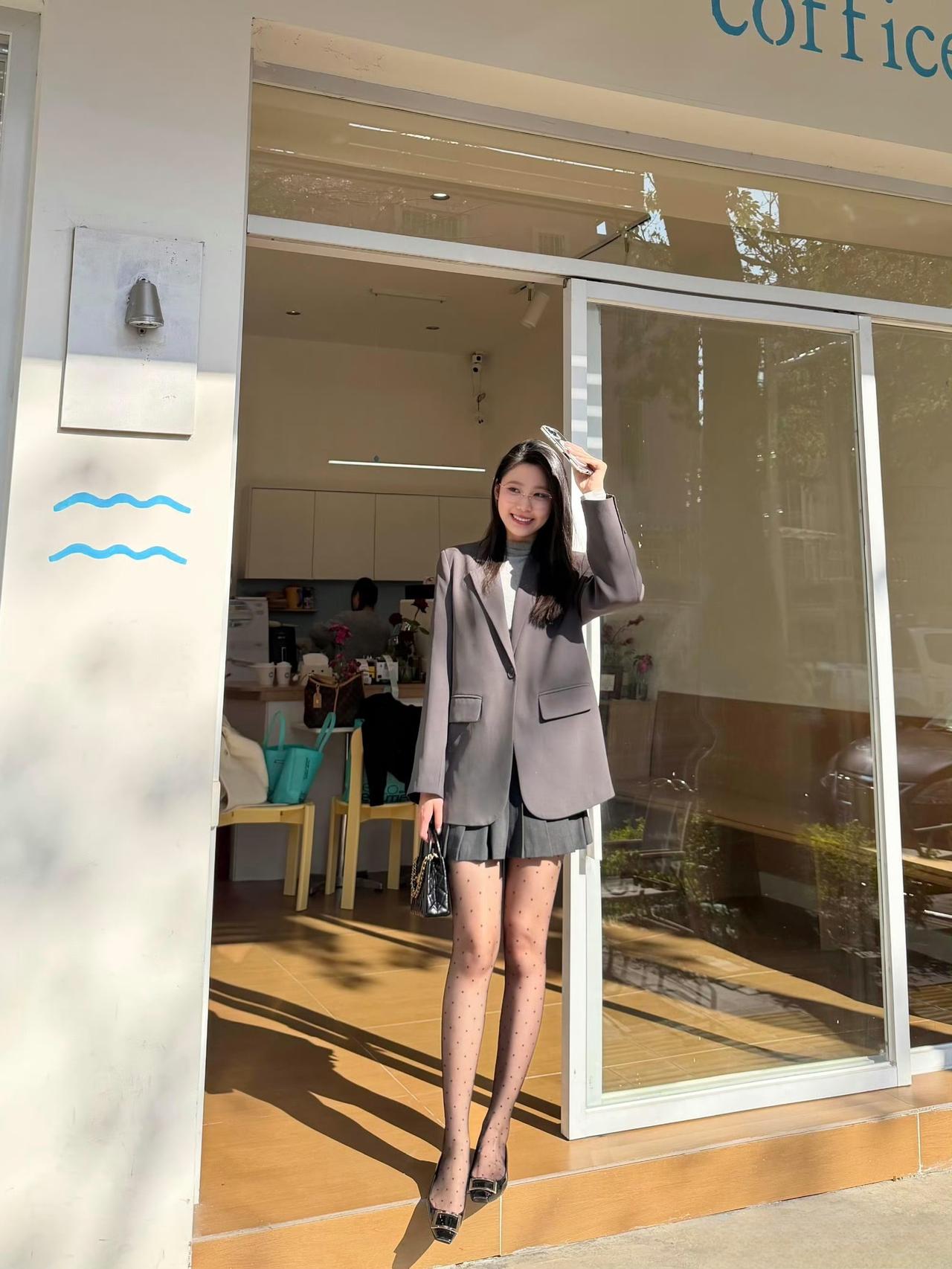 这套穿搭是甜酷干练的灰调轻熟风,把职场利落感和少女细节融合。灰色宽松西装自带干练