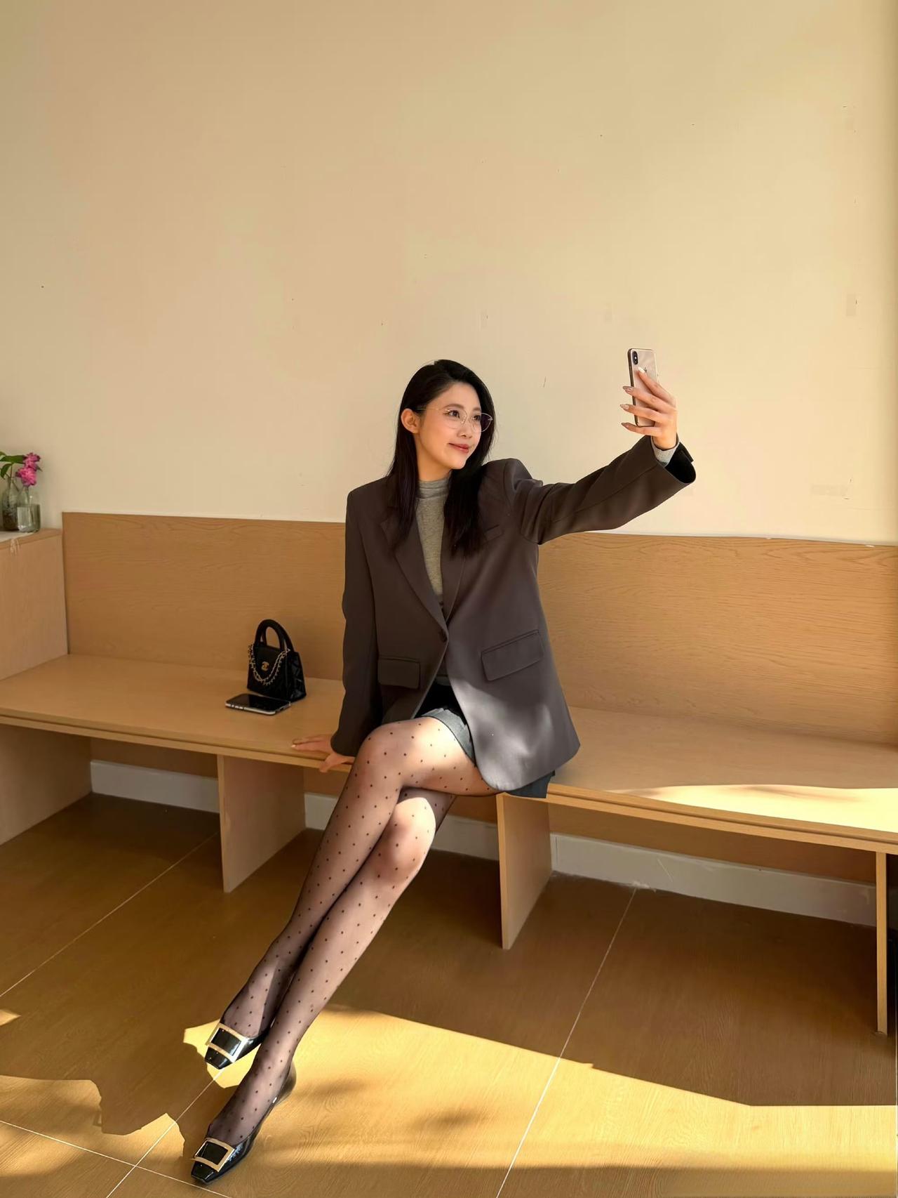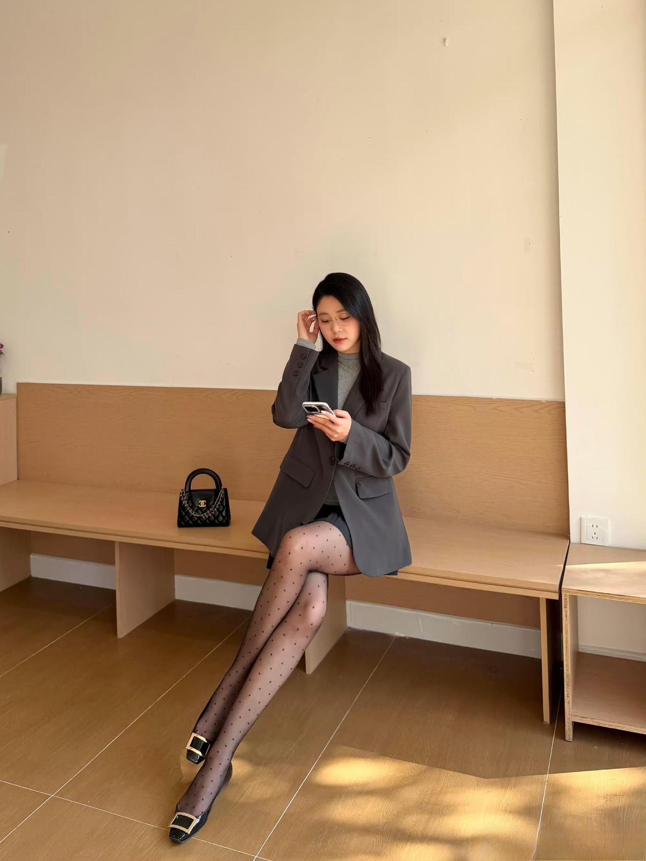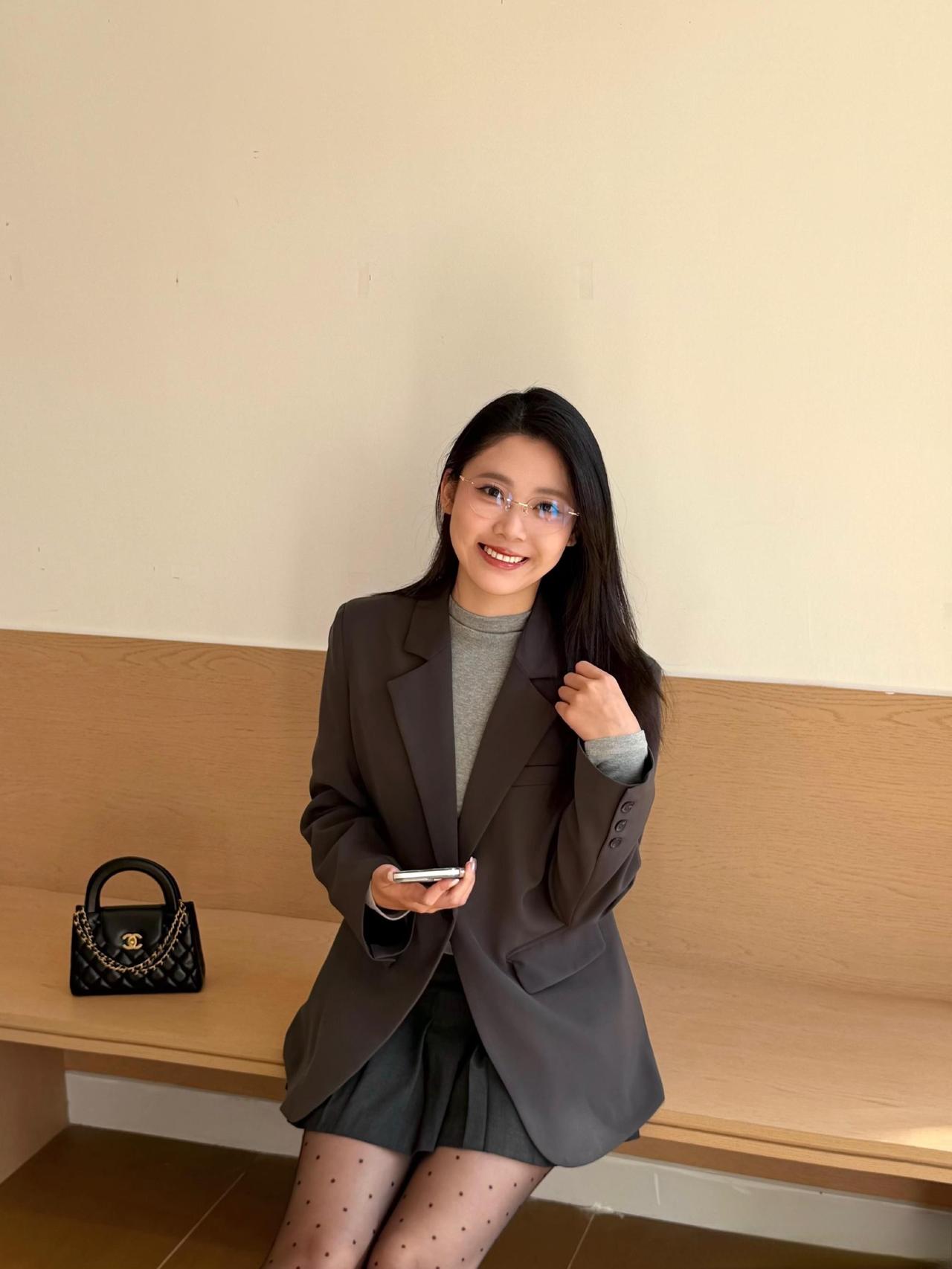 这套穿搭是甜酷干练的灰调轻熟风,把职场利落感和少女细节融合。灰色宽松西装自带干练